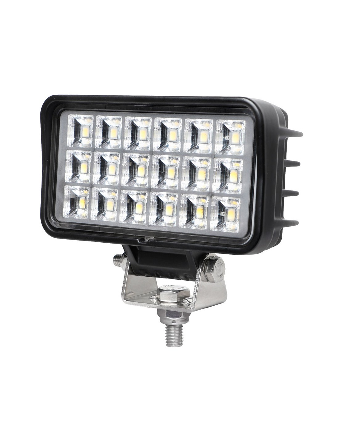 Faro de trabajo rectangular 15 w, 18 led flujo luminoso 1500 lm 6000 k luz fría tensión de funcionamiento 9-32 v grado de protección ip67 vida estimada 50000 h interruptor trasero incluye soporte con kit tornillería, dimensiones 11 x 5,5 x 6 cm