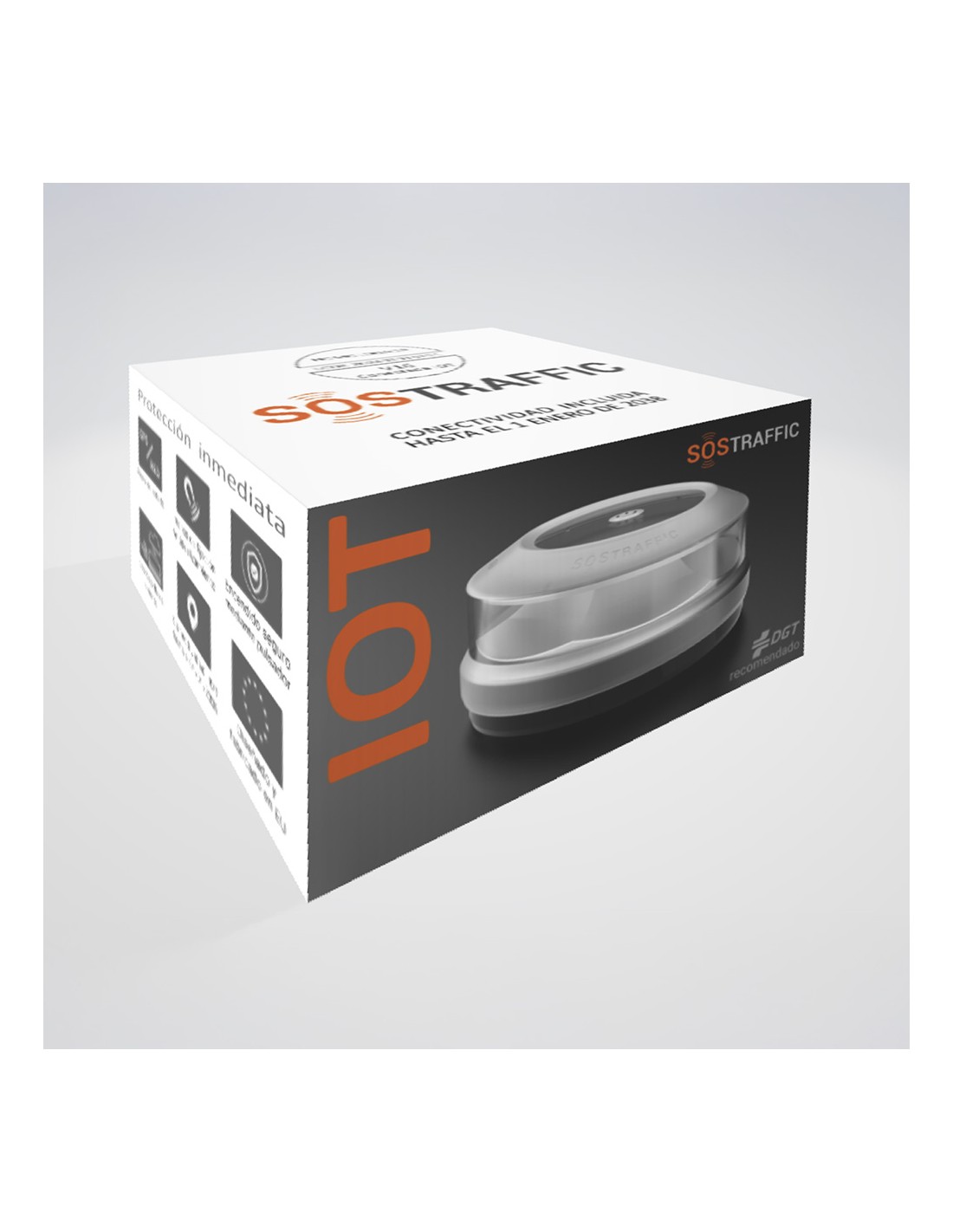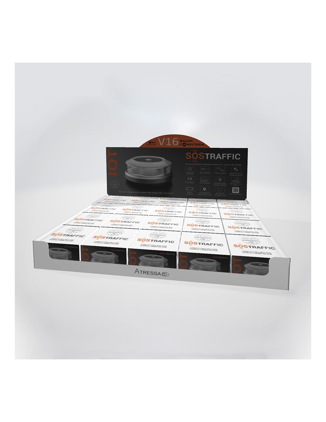 Baliza v16 de emergencia homologada conectada geolocalizable con dgt 3.0 sos trafic sim valida hasta 31/12/2038 ip54, visible 360° a 1 kmmáximo seis horas de autonomía, con ventosa, funciona con 1 pila 9v incluida presentación en expositor de 20 unidades