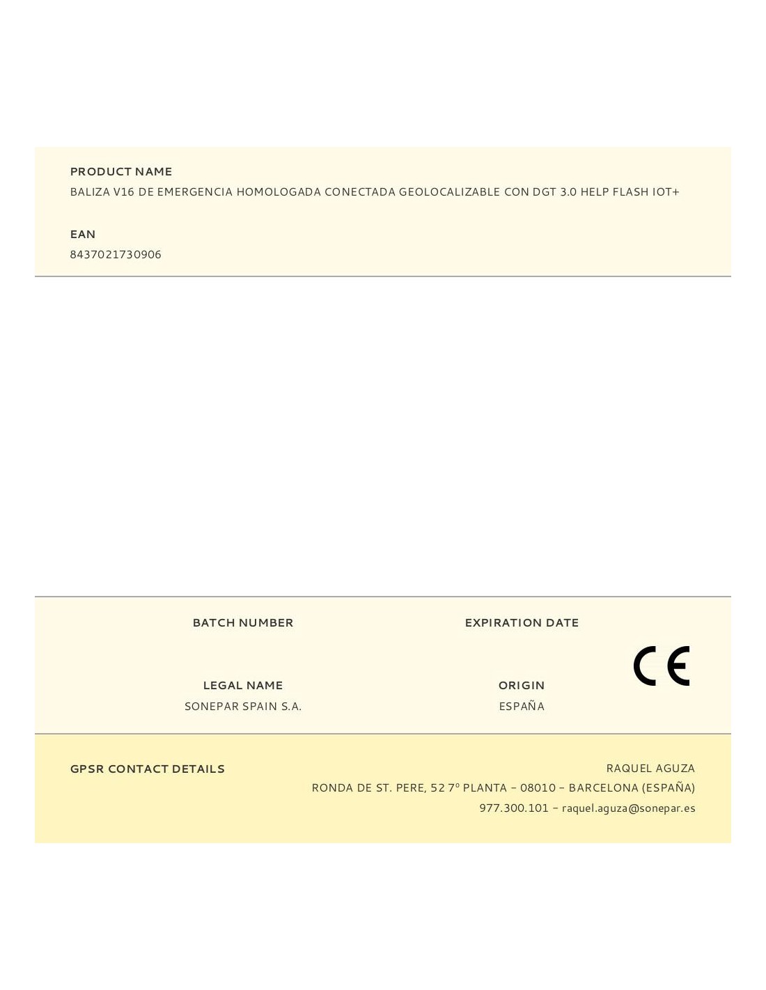 Baliza v16 de emergencia homologada conectada geolocalizable con dgt 3.0 sim válida hasta 31/12/2038 ip54, visible 360° horizontal, ± 8 en vertical temperatura de uso: -10 y 50°c autonomía aprox. 2 h, magnética, funciona con 1 pila 9 v 6lr61 incluida resistencia al viento +180 pa dimensiones: 85 x 36,6 mm