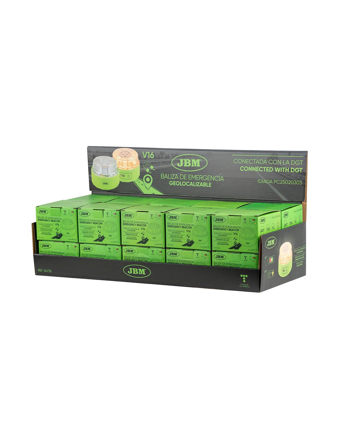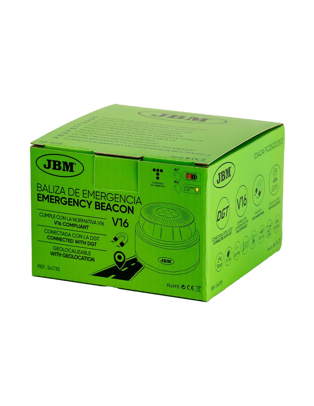 Baliza v16 de emergencia homologada conectada geolocalizable con dgt 3.0 jbm sim válida hasta 01/01/2038 ip54, visible a 1 km 360° -10 y 50°c sujeción magnética máximo tres horas de autonomía, funciona con 4xaa pilas incluidas ø85 x 60 mm