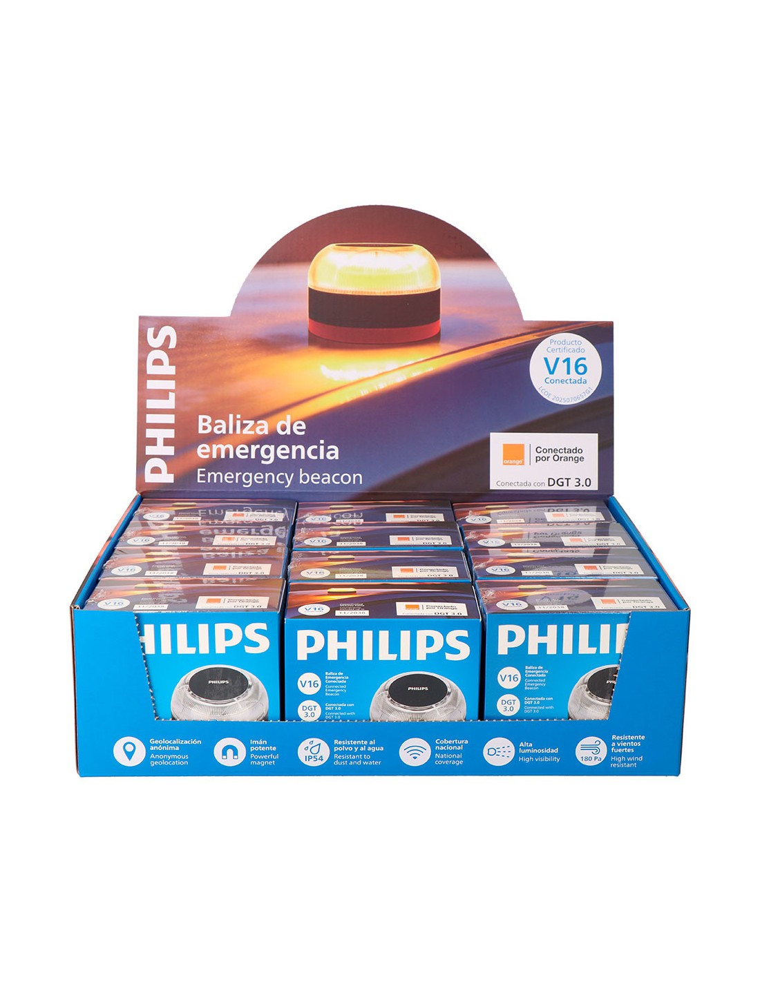 Baliza v16 de emergencia homologada conectada geolocalizable con dgt 3.0 sim válida hasta 30/11/2038 ip54, visible a 1 km 360° -10 y 50°c sujeción magnética resistencia al viento 180 pa funciona con 3 x aa incluidas ø85 x 53 mm. presentada en expositor de 12 uds