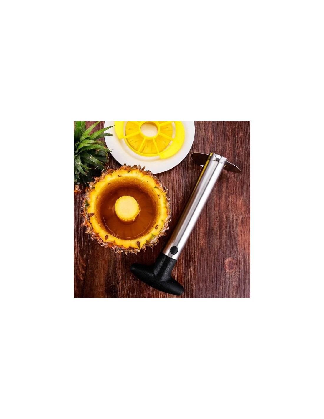 El corta piñas de acero inoxidable o pelador metálico es una herramienta de cocina que presenta un funcionamiento sin complicaciones. Coloque la hoja en el centro de la piña y gire suavemente hasta alcanzar la base de la fruta. Al tirar del mango, obtendrá un anillo de piña perfectamente formado y conservará el jugo en el interior de la piña y una piña perfectamente troceada.
