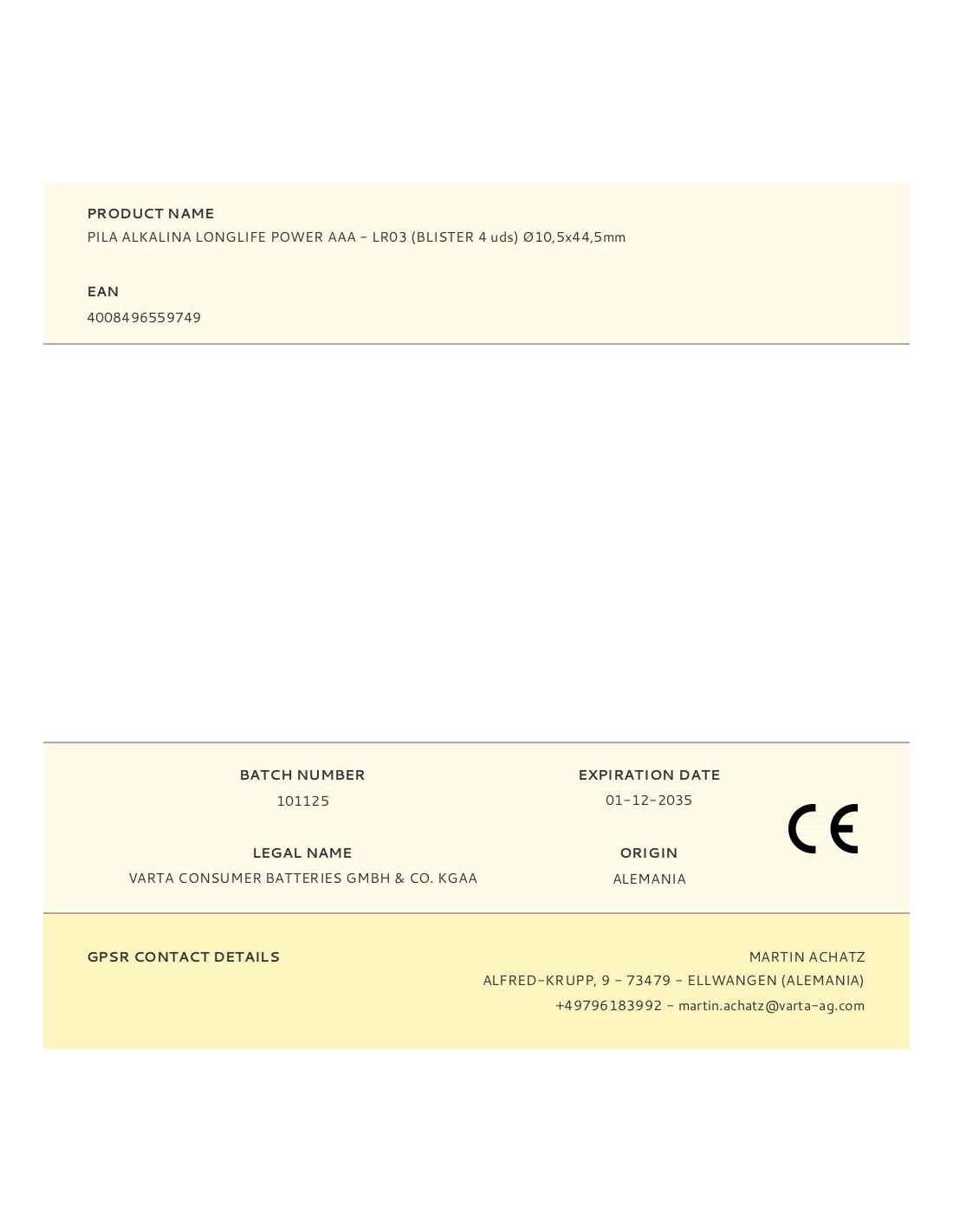 Pila varta alkalina longlife power aaa - lr03 (blister 4 unid.) ø10,5x44,5mm (diámetro/alto)