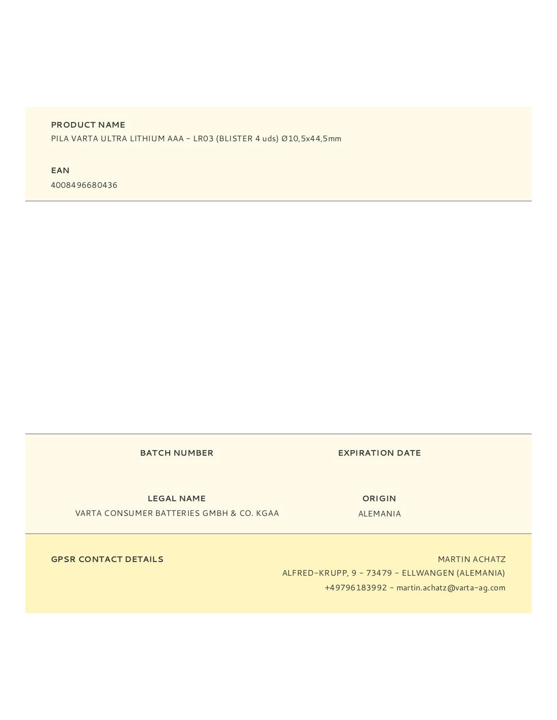 Pila varta ultra lithium aaa - lr03 (blister 4 unid.) ø10,5x44,5mm (diámetro/alto)