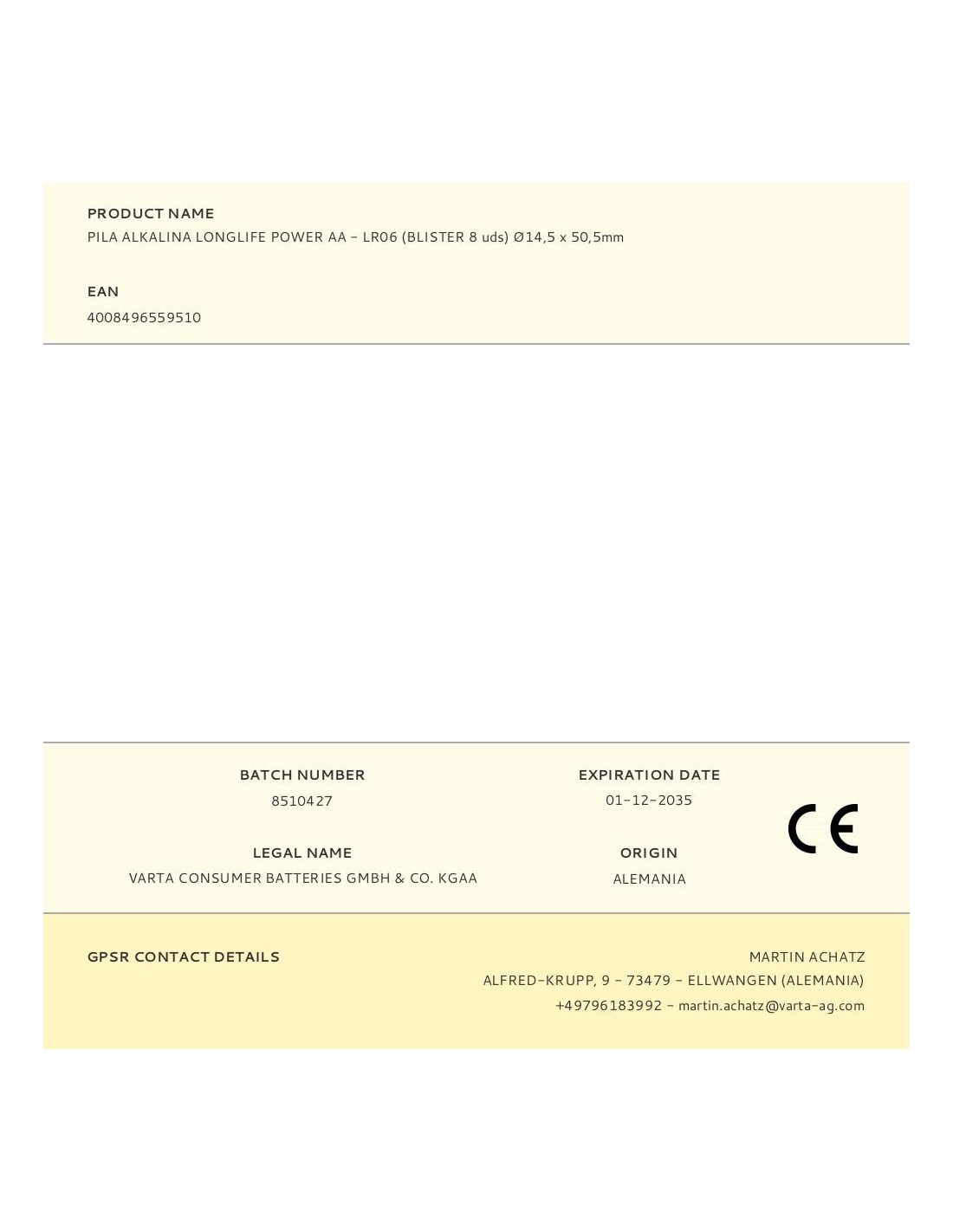 Pila varta longlife power aa - lr06 (blister 8 unid.) ø14,5x50,5mm (diámetro/alto)