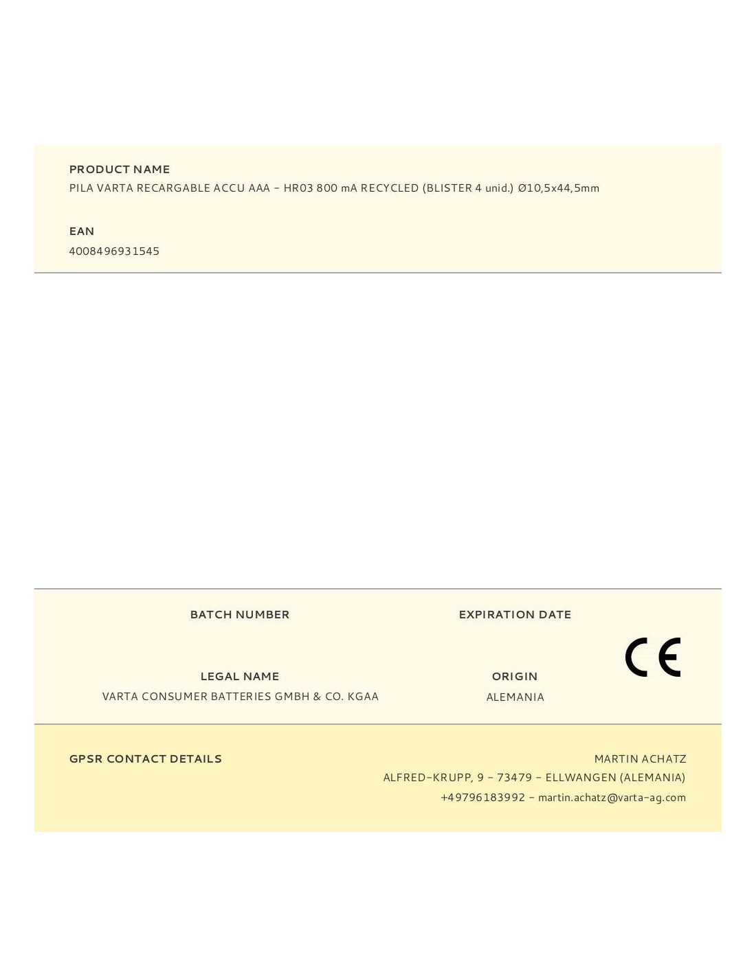 Pila varta recargable accu aaa - hr03 800ma recycled (blister 4 unid.) ø10,5x44,5mm (diámetro/alto)