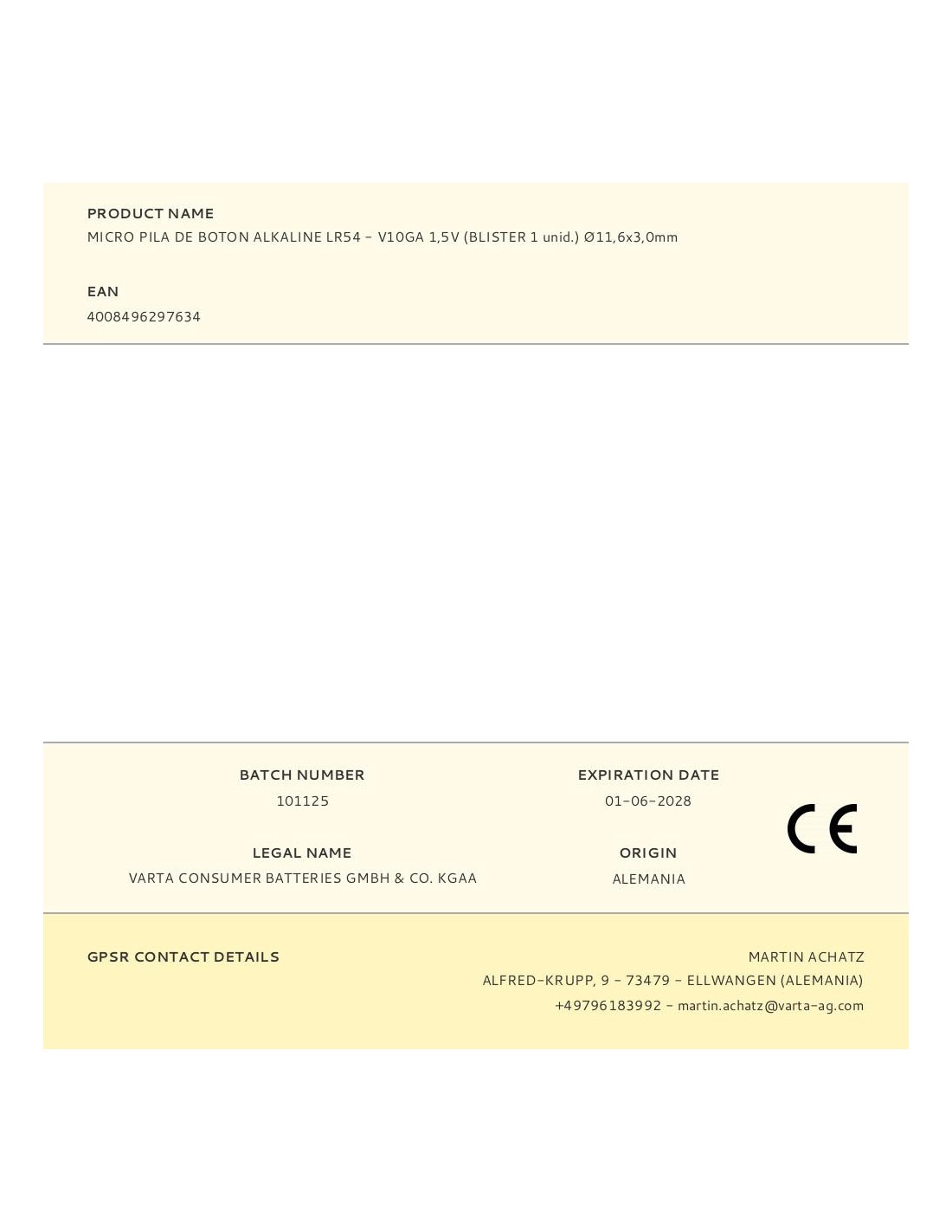 Micro pila de boton alkaline lr54 - v10ga 1,5v (blister 1 unid.) ø11,6x3,0mm