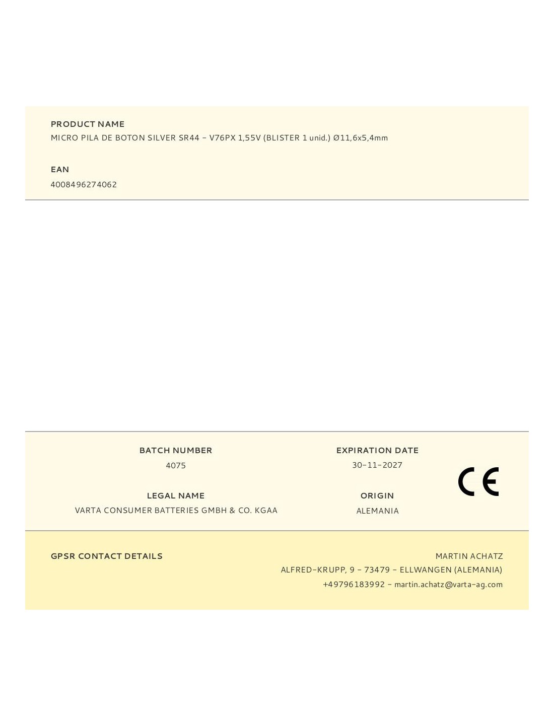 Micro pila de boton varta silver sr44 - v76px 1,55v (blister 1 unid.) ø11,6x5,4mm (diámetro/alto)