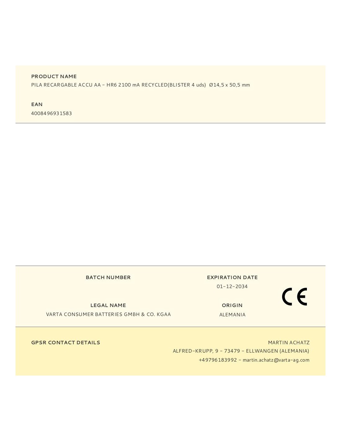 Pila varta recargable accu aa - hr6 2100ma recycled(blister 4 unid.) ø14,5x50,5mm (diámetro/alto)
