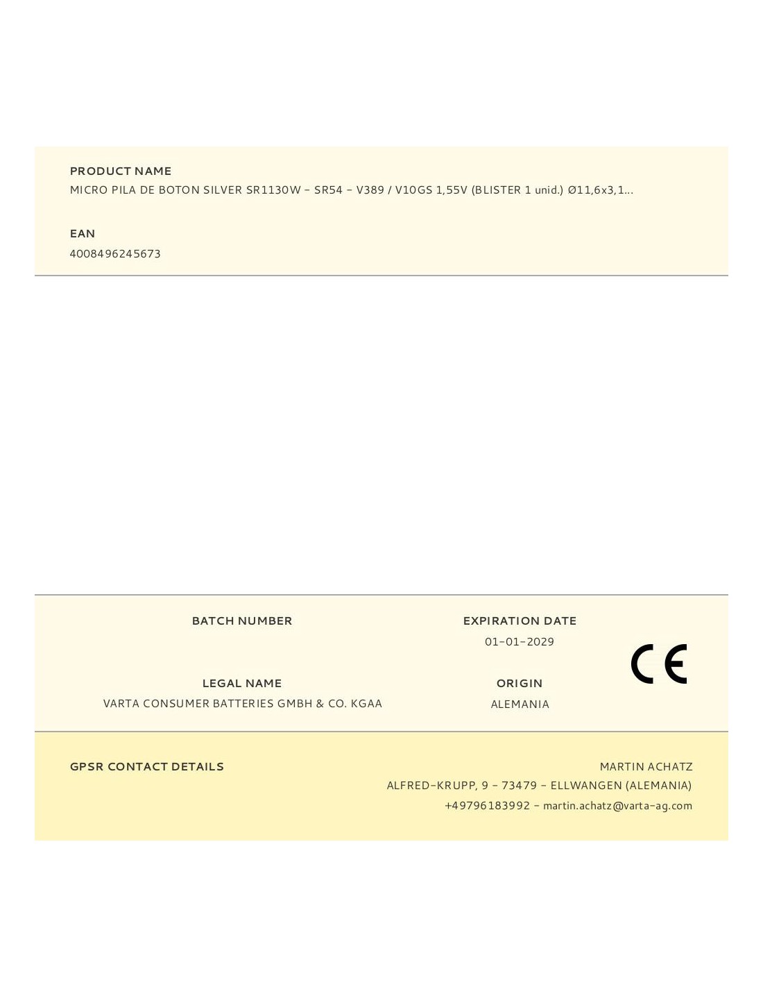 Micro pila de boton varta silver sr1130w - sr54 - v389 / v10gs 1,55v (blister 1 unid.) ø11,6x3,1mm (diámetro/alto)