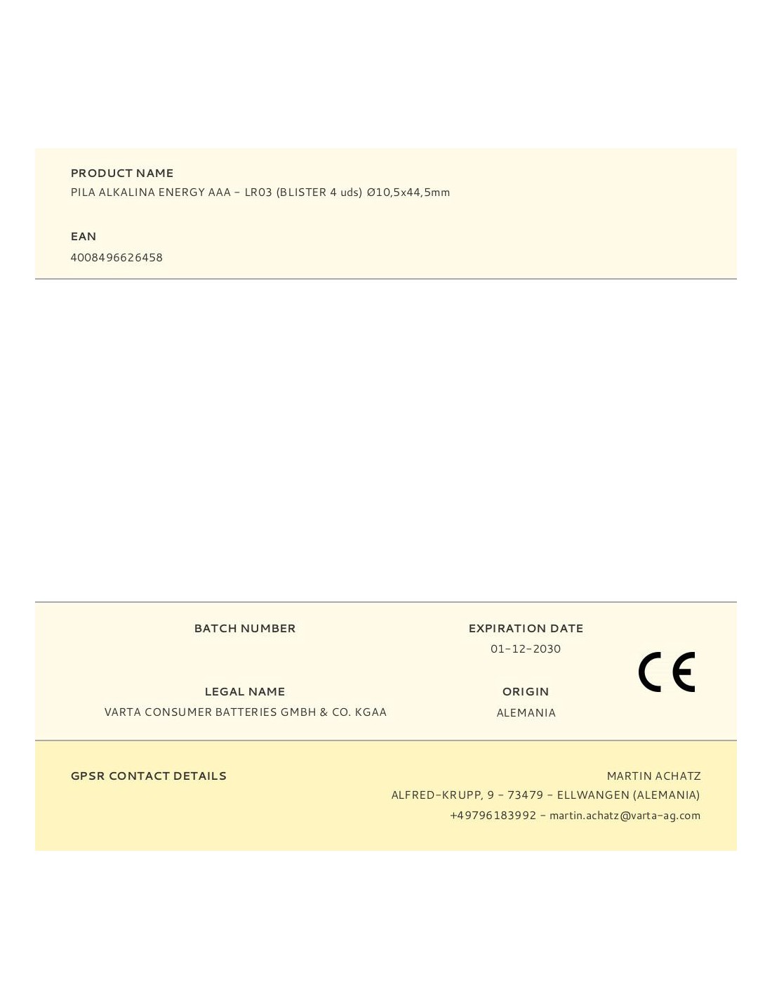 Pila varta aaa - lr03 "energy value pack" (blister 4 unid.) ø10,5x44,5mm (diámetro/alto)
