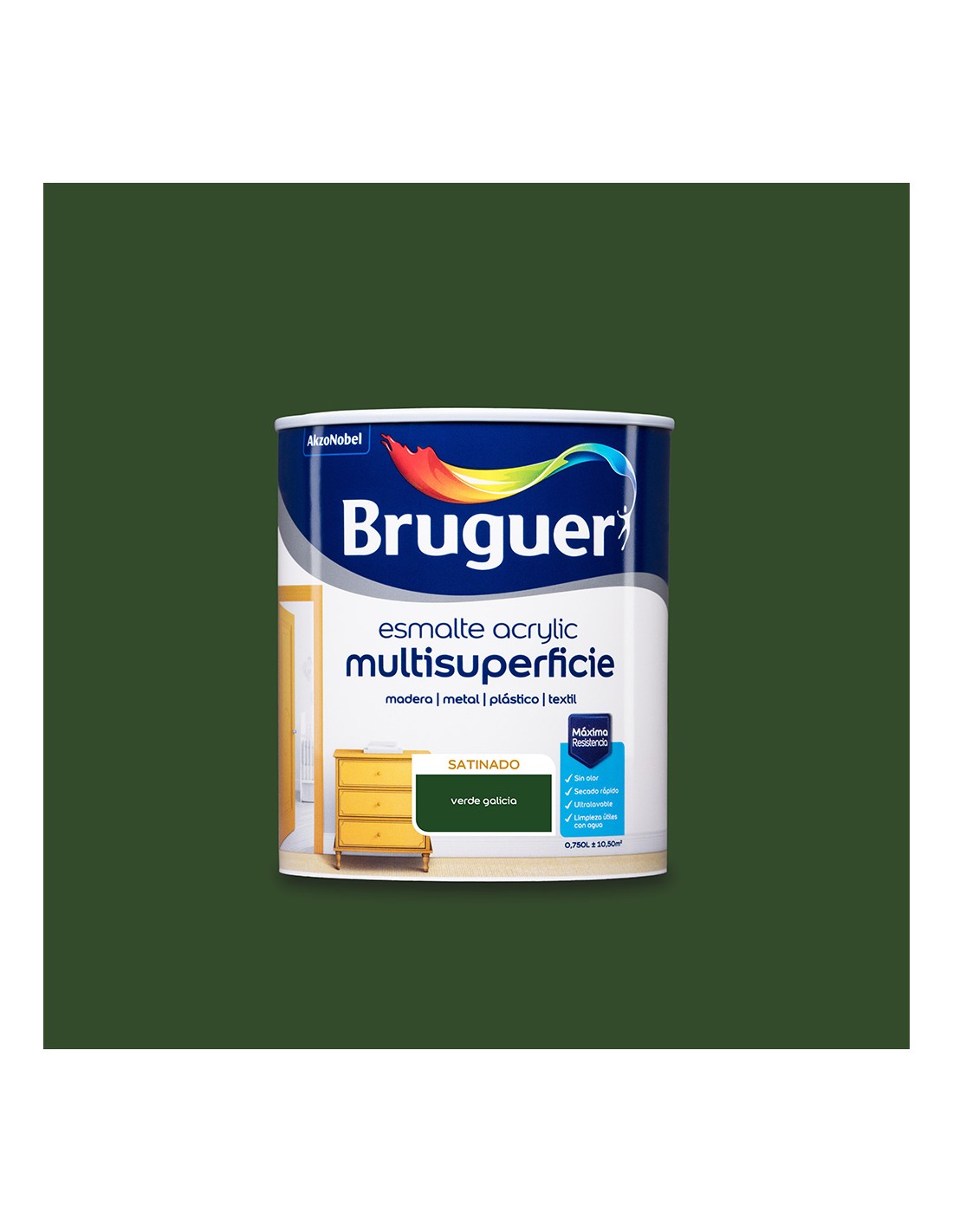 Esmalte acrylico multisuperficie satinado verde galicia 750 ml para interior y exterior con acabado lacado suave al tacto. sin olor y de rápido secado. sin disolventes