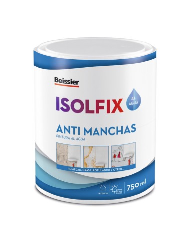 Pintura al agua isolfix anti manchas blanco 750 ml pintura cubremanchas al agua para aislar y cubrir manchas de humo, nicotina, hollin, cafe, taninos, aceite, grasas, manchas de aguas secas, rotuladores, etc. excelente cubrición de manchas de lignina en placas de carton-yeso. ideal para cubrir manchas en cocinas y baños. sin olor. libre de disolventes y amoniaco. lavable. resistencia al frote en humedo: clase 1 segun une-en 13300. resistente a la humedad ambiente. repintable en 20 minutos. no gotea ni amarillea. color blanco