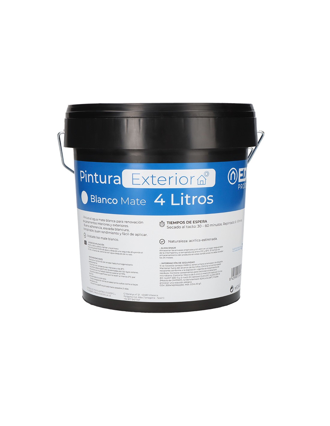 Pintura plástica acrílica estirenada interior/exterior blanco mate 4 l de acabado liso, impermeable, transpirable de alta adherencia a los diferentes materiales utilizados en construcción. aplicación en cemento, mortero de cemento, ladrillo poroso, madera antes del barnizado. uso en fachadas exteriores e interiores. buen rendimiento 4 - 7 m por litro i 2 - 4 m por kg (indice de blancura berger 84 - 86). tiempos de espera: el producto no mancha al tacto transcurrido 30 - 60 minutos y se puede repintar a las 6 - 8 horas. secado total en 15 - 20 dias. brillo 85°: 5. opacidad:87 - 89%. finura: 20 - 25 micras/fino. contenido max en cov permitidos: 40 g/l. contenido max en cov producto:30 g/l. cumple con normativas une-en1062-1, une-en iso 2813, une 48073, une-en iso 6504-3, une-en 2811-1, une-en iso 1524 / une en1062-1, une-en iso 23811, une 48301
