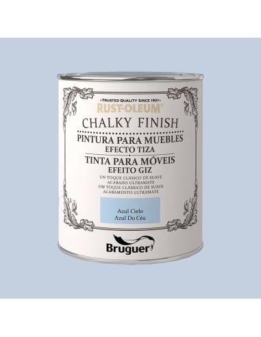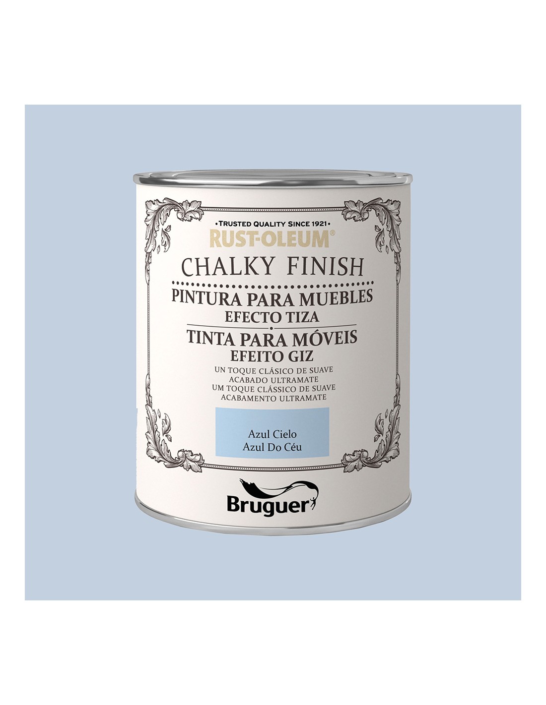 Rust-oleum chalky finish muebles azul cielo 0,750l 5397549 bruguer. pintura al agua efecto tiza, se puede aplicar en todo tipo de superficies como madera, metal, piedra, arcilla, yeso o incluso plástico, con un excelente resultado. te permite customizar desde un jarrón antiguo, una lámpara, un cesto de playa o incluso unos cojines, ya que se puede aplicar también sobre tela