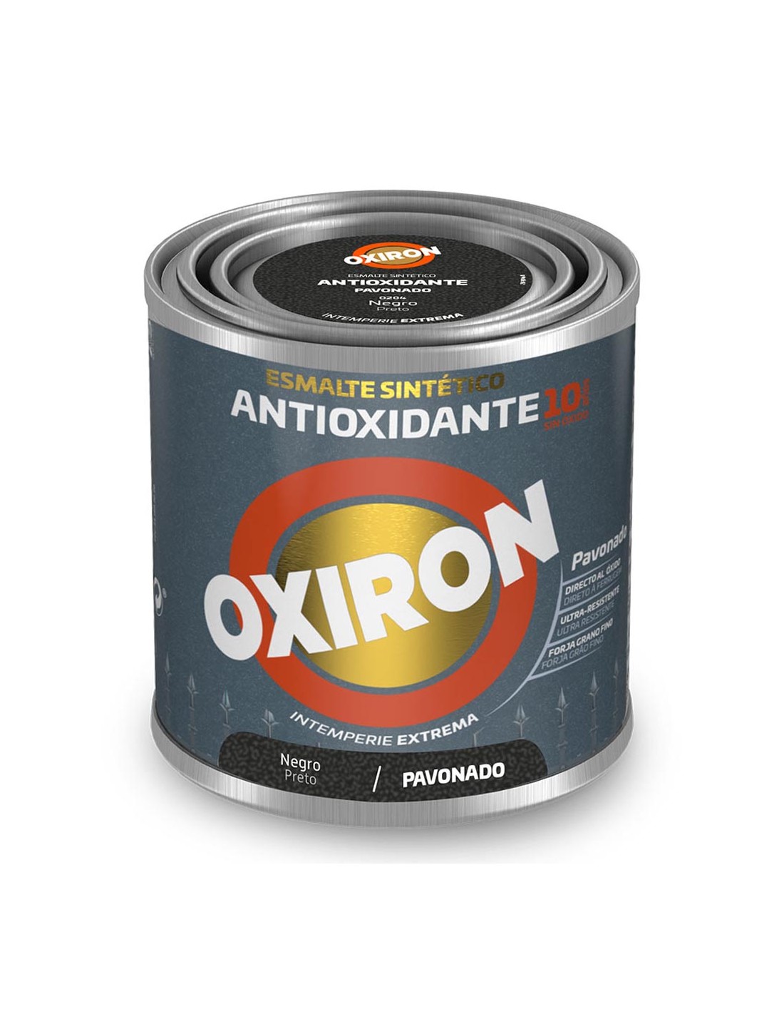 Esmalte sintético metálico antioxidante negro pavonado 250 ml de altos sólidos, de gran adherencia, elasticidad y resistencia a la intemperie, de aplicación directa sobre acero y óxido sin necesidad de preparación previa. excelente protección y decoración de cualquier superficie de hierro, a las que confiere un acabado tipo forja de grano fino (pavonado). excelente aplicación a brocha y rodillo, amplio tiempo abierto, que facilita los retoques. colores entremezclables y altamente sólidos a la luz
