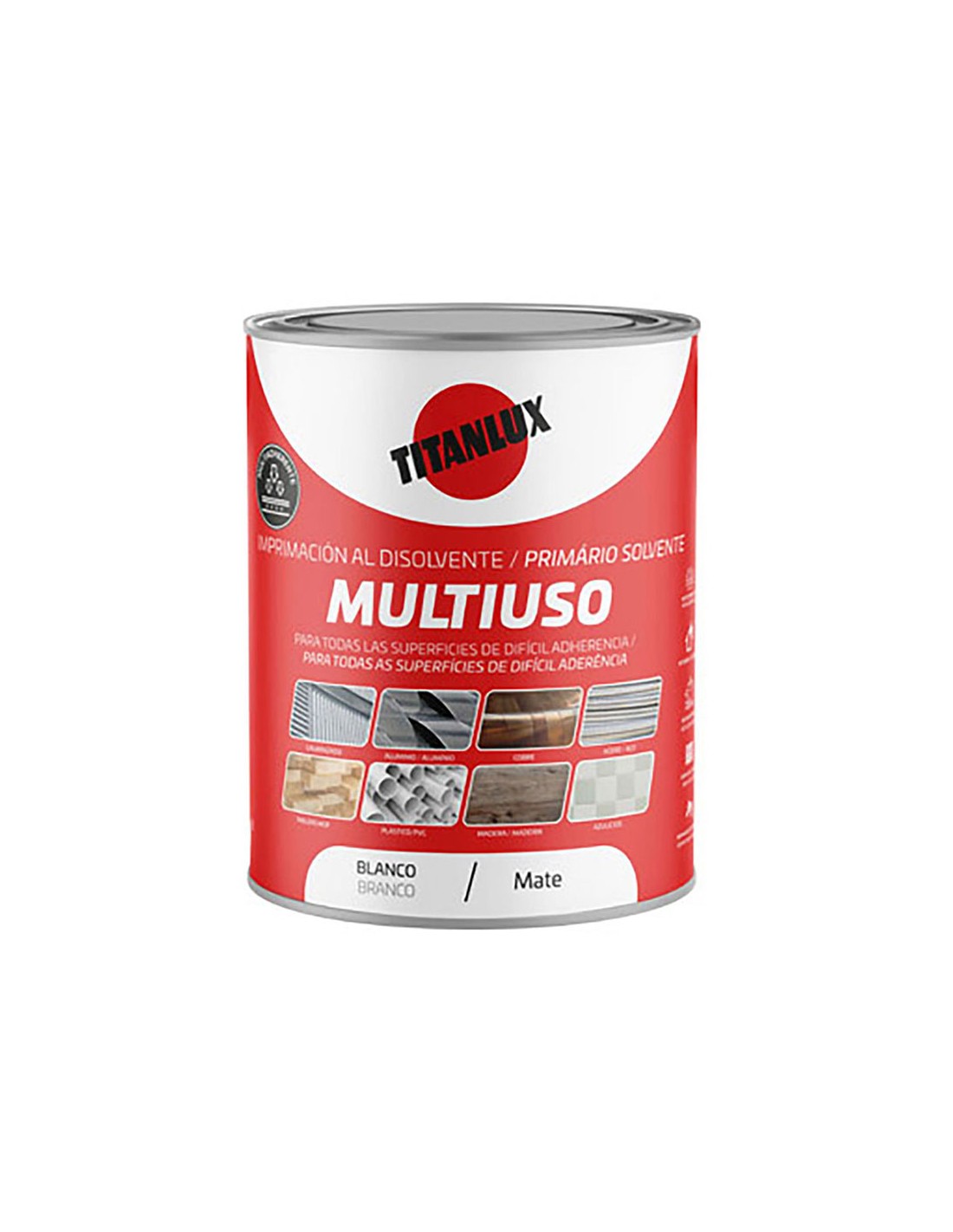 Imprimación multiuso blanco mate 250 ml. anticorrosiva al disolvente de secado rápido, alta cubrición, buen sellado para todo tipo de superficies. puente de adherencia sobre un gran número de soportes sin pintar o pintados con diferentes recubrimientos. tratamiento efectivo para manchas de rotuladores, café, etc. protección contra el óxido en superficies de hierro. preparación adherente para: galvanizado, aluminio, acero, latón, cobre y zinc. mejora la adherencia en superficies de pvc duro, melamina y azulejos. para el pintado de azulejos la imprimación multiuso ofrece una excelente adherencia. no aplicar sobre poliestireno expandido. tiempo de secado 1 - 1,5 horas