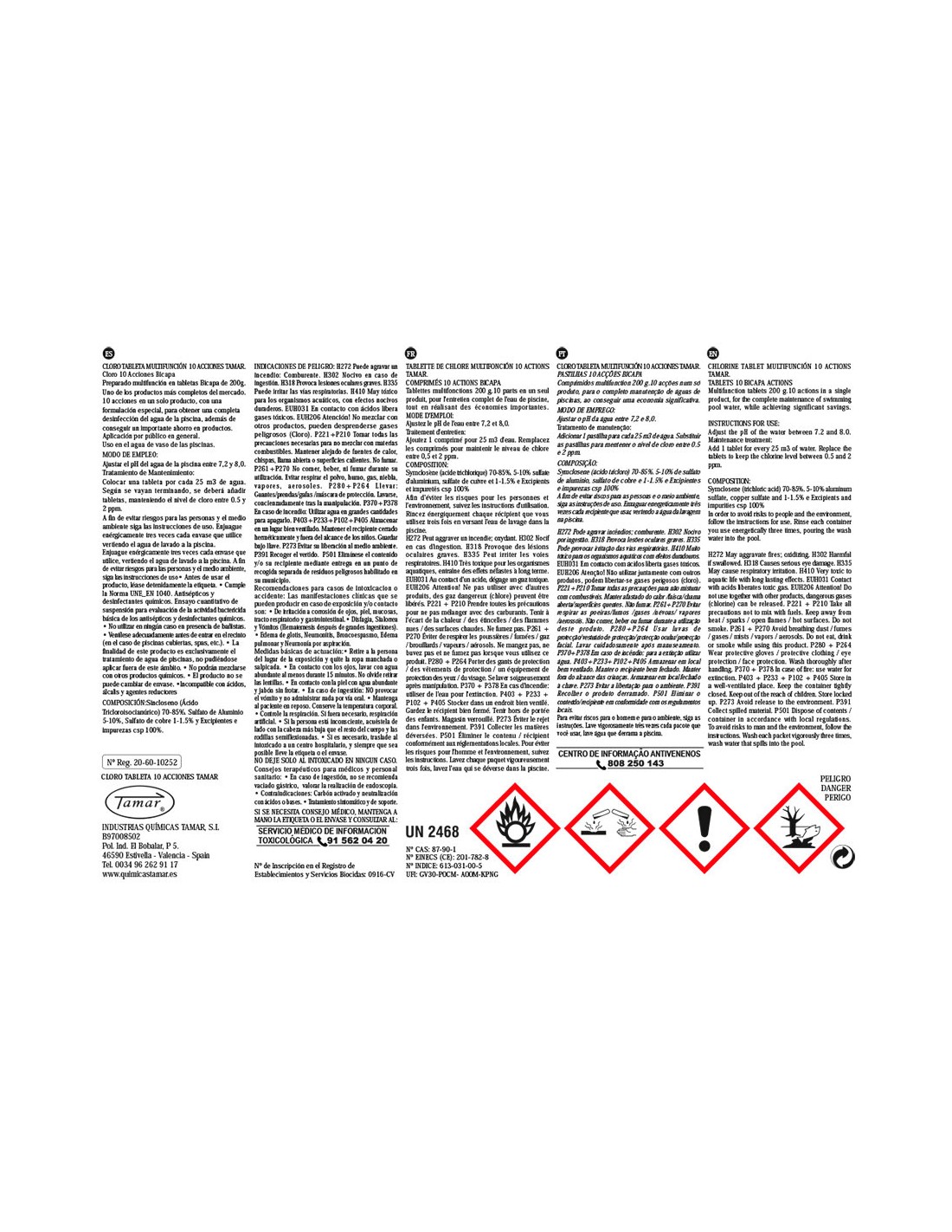 Cloro 10 acciones tableta 5kg fusion tamar "utilice los biocidas de forma segura. lea siempre la etiqueta y la informacion sobre el biocida antes de usarlo"