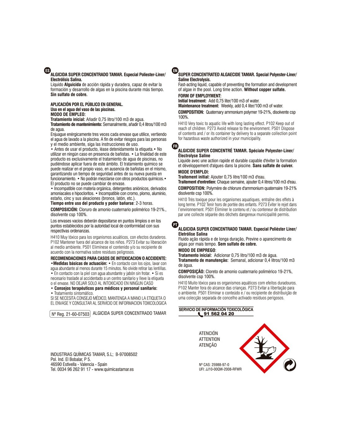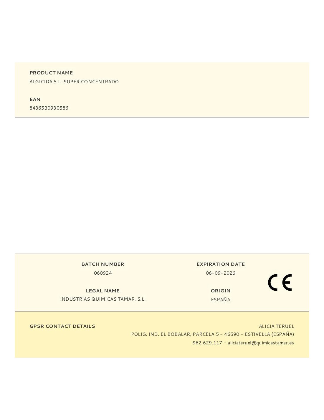 Algicida 5 l. super concentrado.especial para piscina electrólisis salina y poliester, liner. liquido de accion rapida y duradera capaz de evitar la formacion y desarrollo de algas en la piscina durante mas tiempo. sin sulfato de cobre
