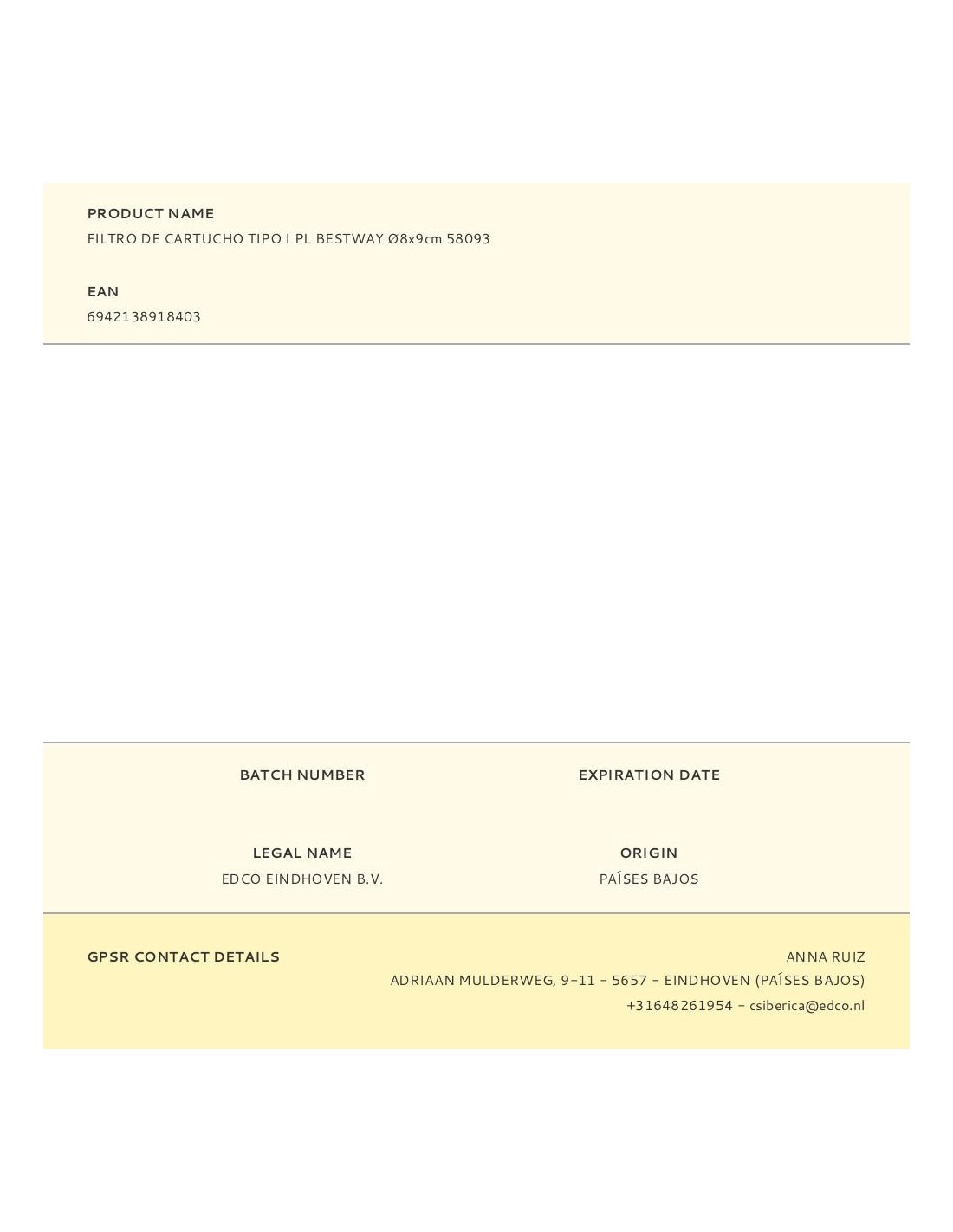 Filtro de cartucho tipo i pl bestway 58093 dimensiones: ø8x9cm (diametro/altura)