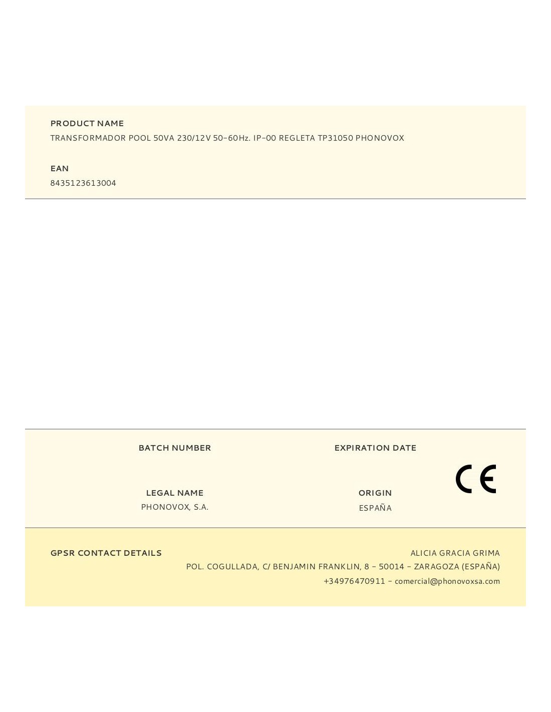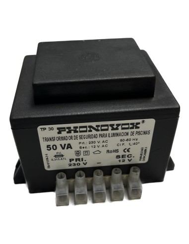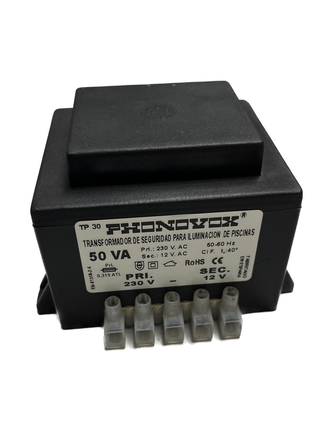 Transformador pool 50va 230/12v 50-60hz. ip-00 regleta tp31050 phonovox transformador de seguridad para alimentación de focos subacuáticos de 12vac ( piscinas). potencia nominal 50va, carga de hasta 30w de focos led ó 50w de focos incandescentes. carcasa plástica de poliamida, encapsulado en resina de poliuretano, clase ii, norma iec61558, conexión por regleta de tornillos, indice de protección ip-00. uso interior. peso unitario: 1,15kg. medidas: 98x79x64mm