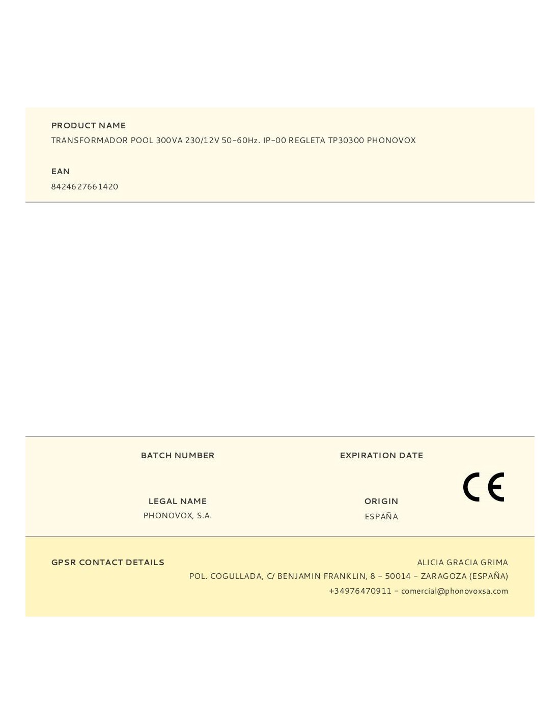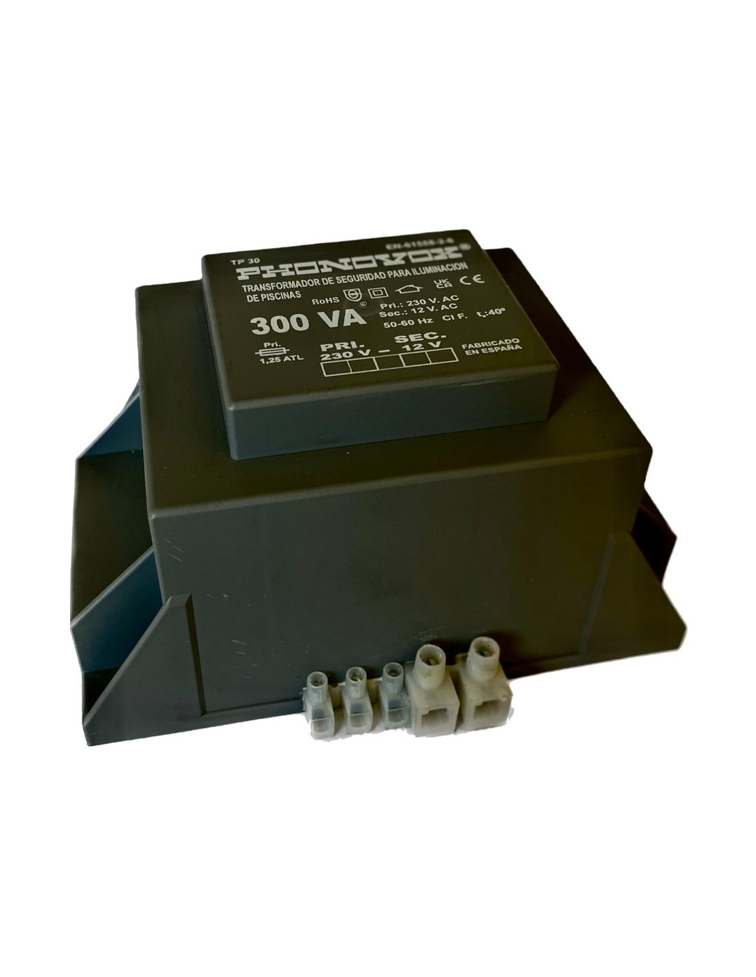Transformador pool 300va 230/12v 50-60hz. ip-00 regleta tp30300 phonovox transformador de seguridad para alimentación de focos subacuáticos de 12vac ( piscinas). potencia nominal 300va, carga de hasta 210w de focos led ó 300w de focos incandescentes. carcasa plástica de poliamida, encapsulado en resina de poliuretano, clase ii, norma iec61558, conexión por regleta de tornillos, indice de protección ip-00. uso interior. peso unitario: 4,30kg. medidas: 165x111x94mm