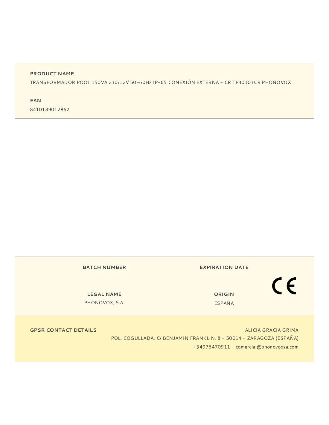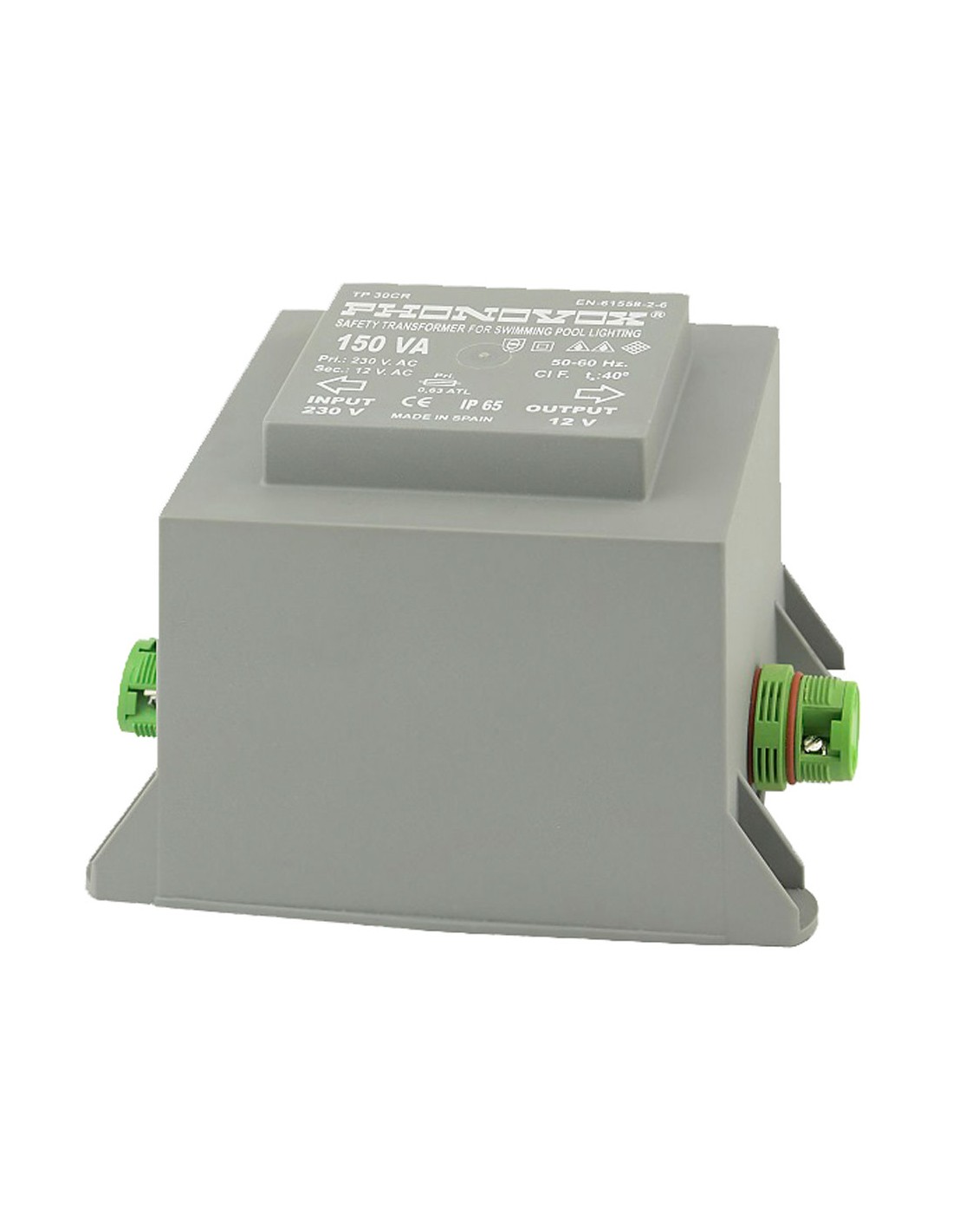 Transformador pool 150va 230/12v 50-60hz ip-65 conexión externa - cr tp30103cr phonovox transformador de seguridad para alimentación de focos subacuáticos de 12vac ( piscinas). potencia nominal 150va, carga de hasta 105w de focos led ó 150w de focos incandescentes. carcasa plástica de poliamida, encapsulado en resina de poliuretano, clase ii, norma iec61558, prensaestopas, cuerpo aislante y juntas ( 2 juegos), protector térmico, indice de protección ip-65. uso exterior. peso unitario: 3,10kg. medidas: 129x72x99mm