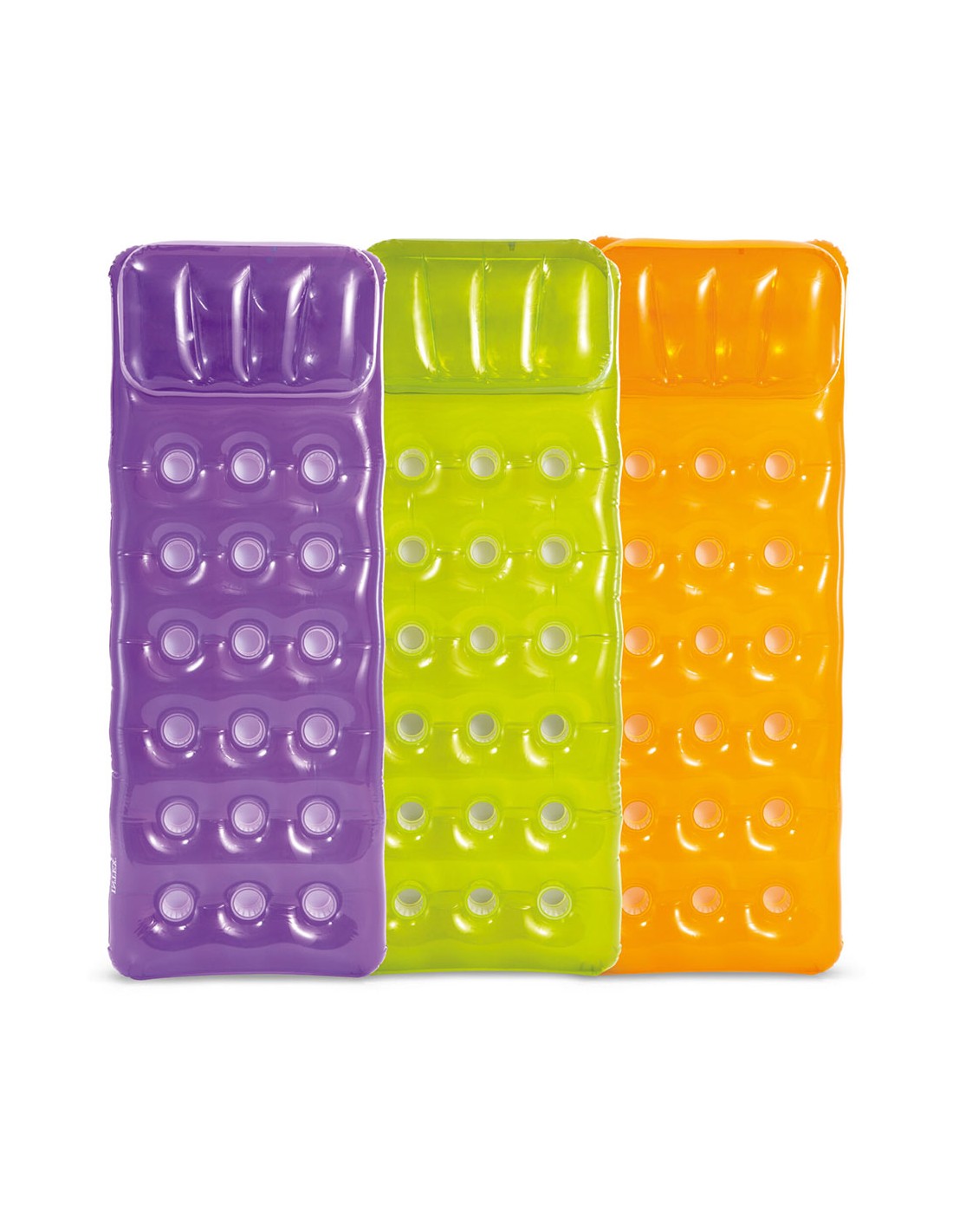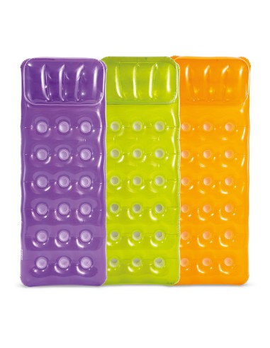 Colchoneta hinchable transparente con fondo colorido, con reposacabeza confortable, 18 alojamientos posavasos, incluye parche de reparación. dimensiones: 188 x 71 cm. colores surtidos