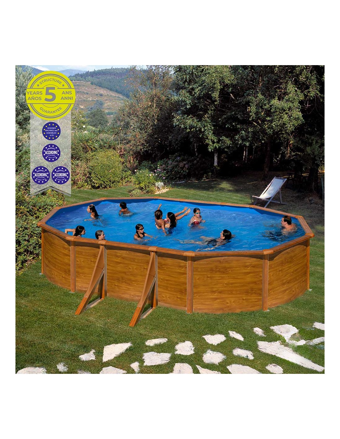 Liner de pvc azul con tratamiento anti-uv - espesor del liner: 30/100. depuradora de arena con un caudal de 4 m/h. incluye la arena sílex (±20 kg). nuestros nuestros filtros están conformes a la norma europea. escalera de seguridad tipo tijera 2x3 peldaños. permite desmontar los peldaños de un lado para impedir el acceso de los niños a la piscina y prevenir accidentes. conforme a la norma europea. estructura del vaso y perfilería de acero galvanizado. protectores de inyección para las uniones entre los perfiles horizontales. incluye conjunto de skimmer. incluye mangueras de conexión