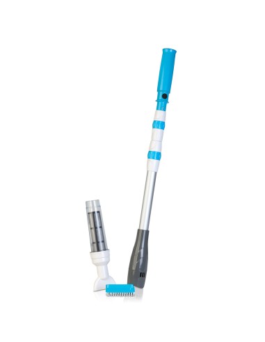 Apto para piscinas elevadas auto-portantes y spa hinchable o rígido cuya profundidad sea 120 cm máximo y 35 cm mínimo. gracias a su tamaño es ligero y manejable. fácil de utilizar. sin cables: funciona con ocho pilas aa ( no incluidas). incluye una escobilla de limpieza filtro de partículas y una pértiga extensible de 3 secciones (133 cm). material: plástico abs y aluminio. máxima potencia 10 w. medida: ø 5,5 x 106-163 cm