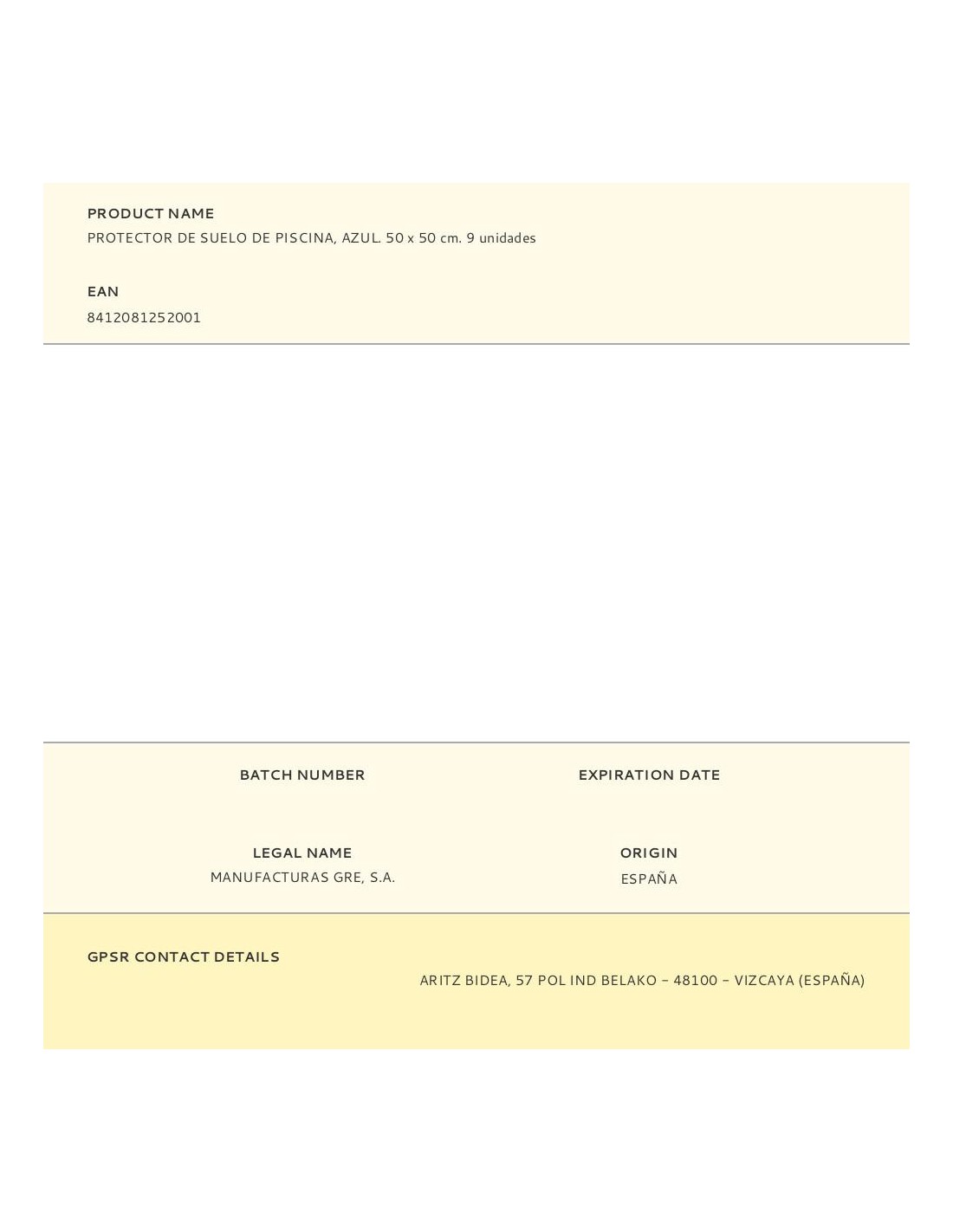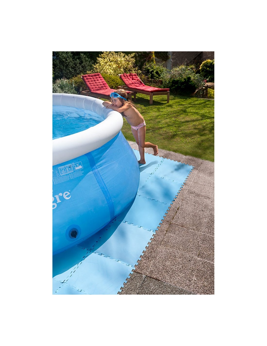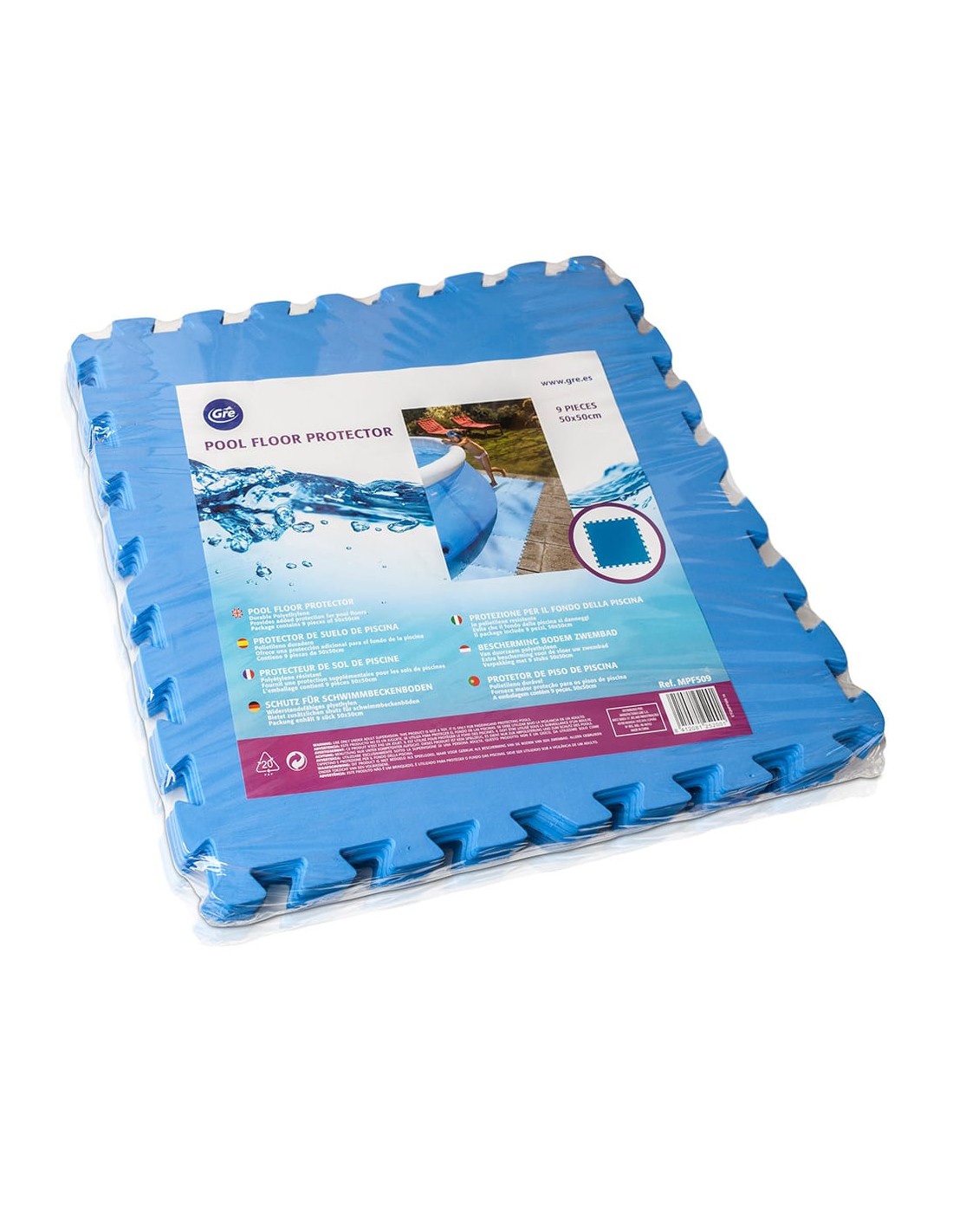 Protector de suelo de piscina. apto para piscinas desmontables sobresuelo. fácil instalación. ligero y manejable. el envase contiene un pack de 9 piezas de 50 x 50 cm 2,25 m. espesor: 4,5 mm. tiene una densidad de 116 kg/m. material: eva (etilvinilacetato). color: azul