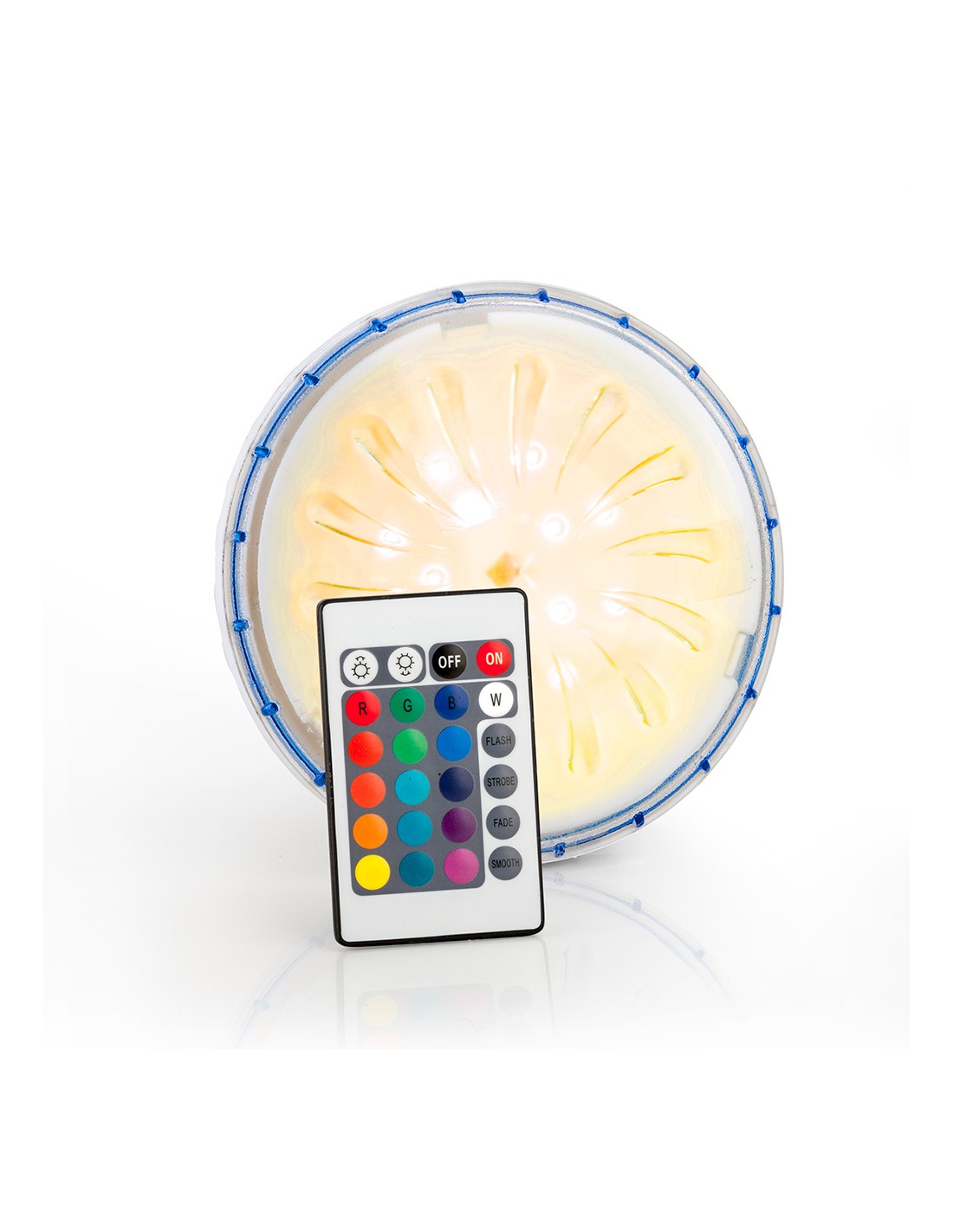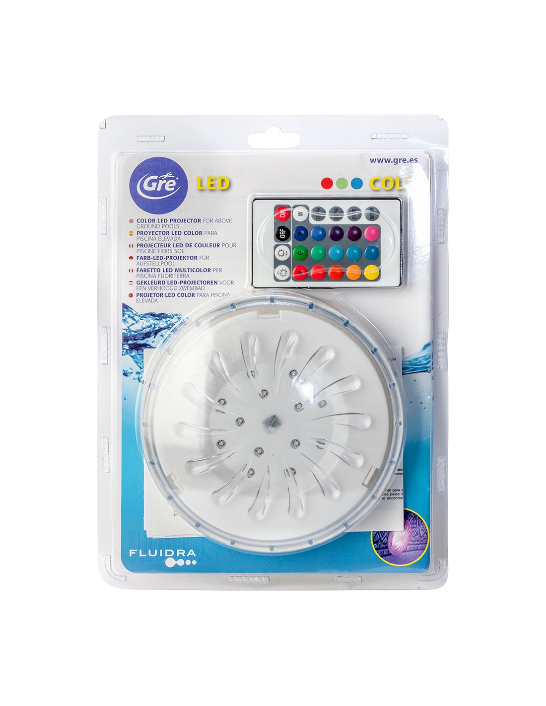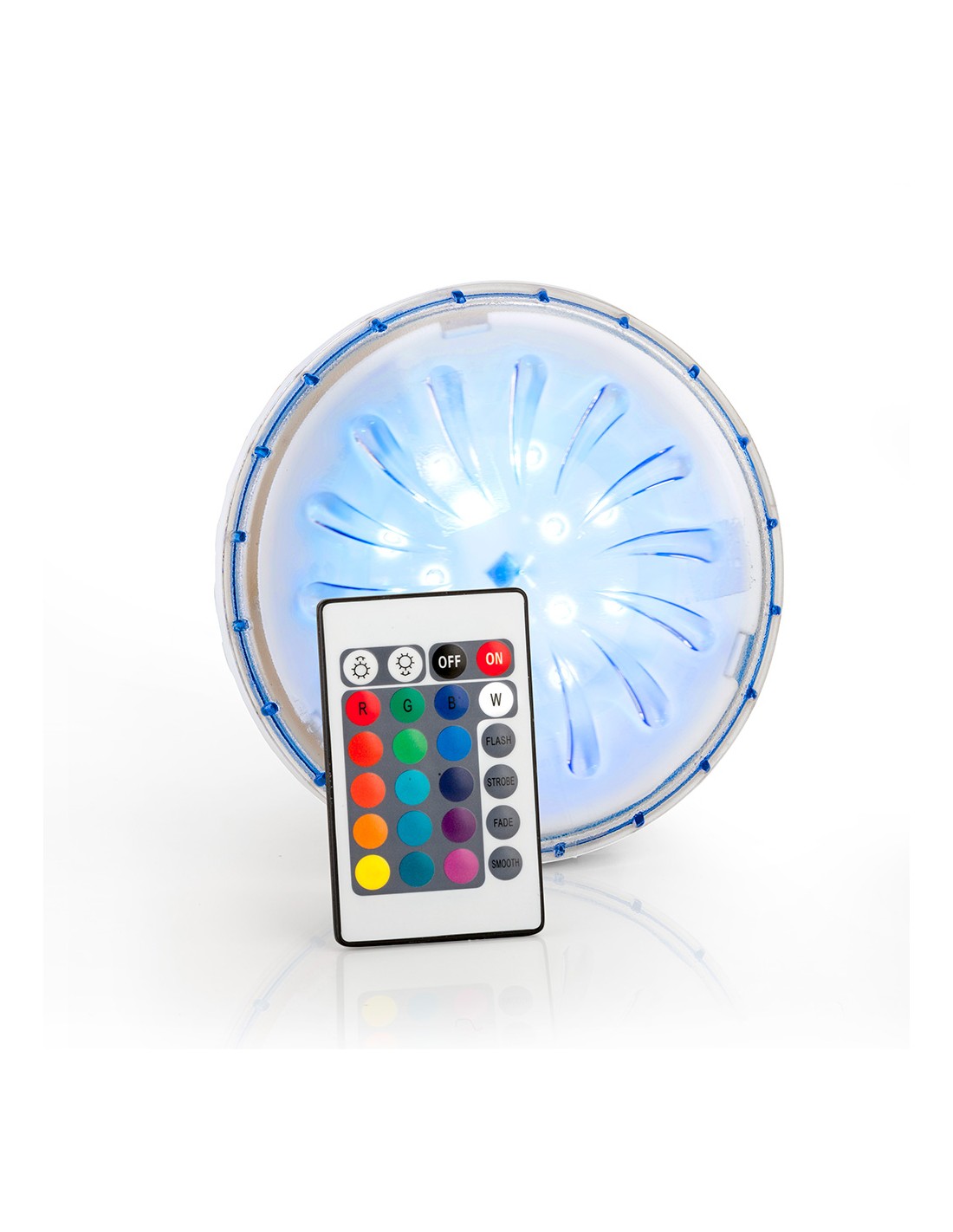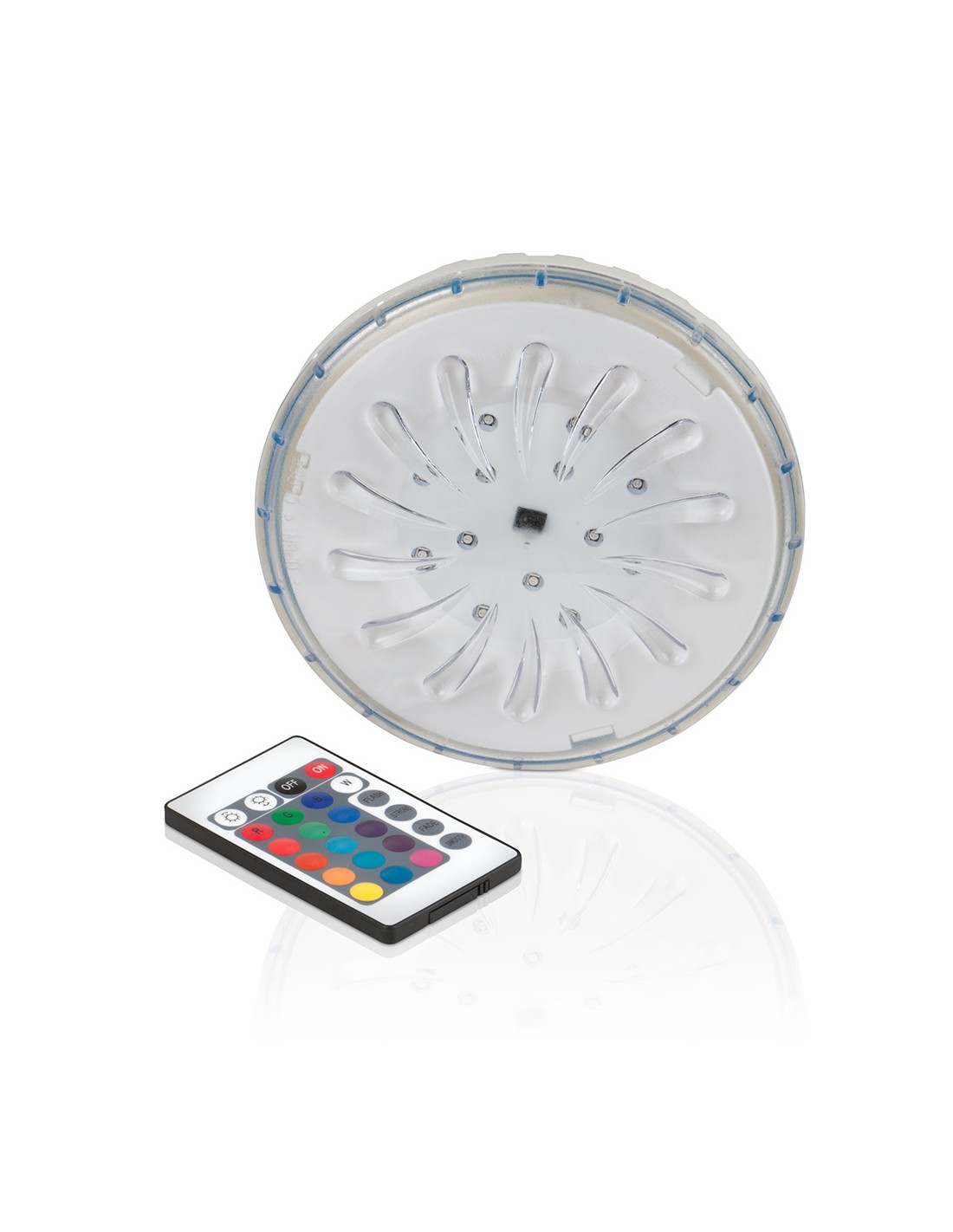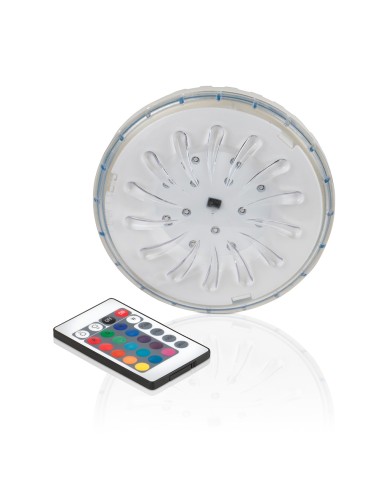 Proyector led color para piscina desmontable de acero. fácil instalación mediante un imán. tecnología led de bajo consumo. potencia: 18 w. incluye mando a distancia para fácil manejo. disponible 15 colores + color blanco. requiere 3 pilas tipo aa (no incluidas). medida: ø 15 x 3 cm