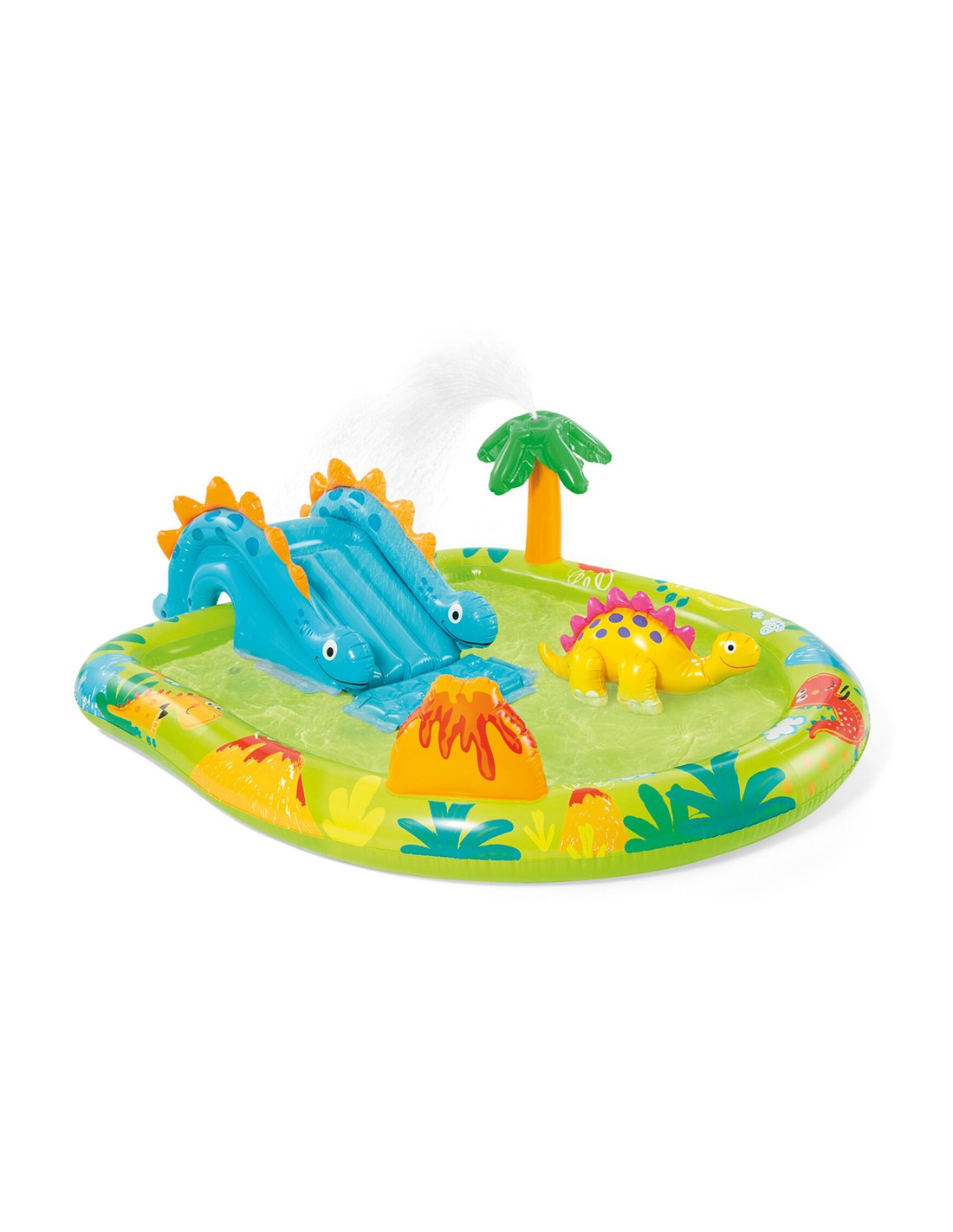 Piscina inflable del centro de juego, redonda para niños. incluye un tobogán acuático, palmera que rocía agua y dinosaurio inflable. compatible con manguera de jardín: el rociador incorporado se conecta a la manguera. especificaciones: requiere filtro: no parche de reparación incluido capacidad: 1-2 niños material: vinilo con forro de vinilo edad: 2+ color: multi. dimensiones: 191 x 152 x 58 cm