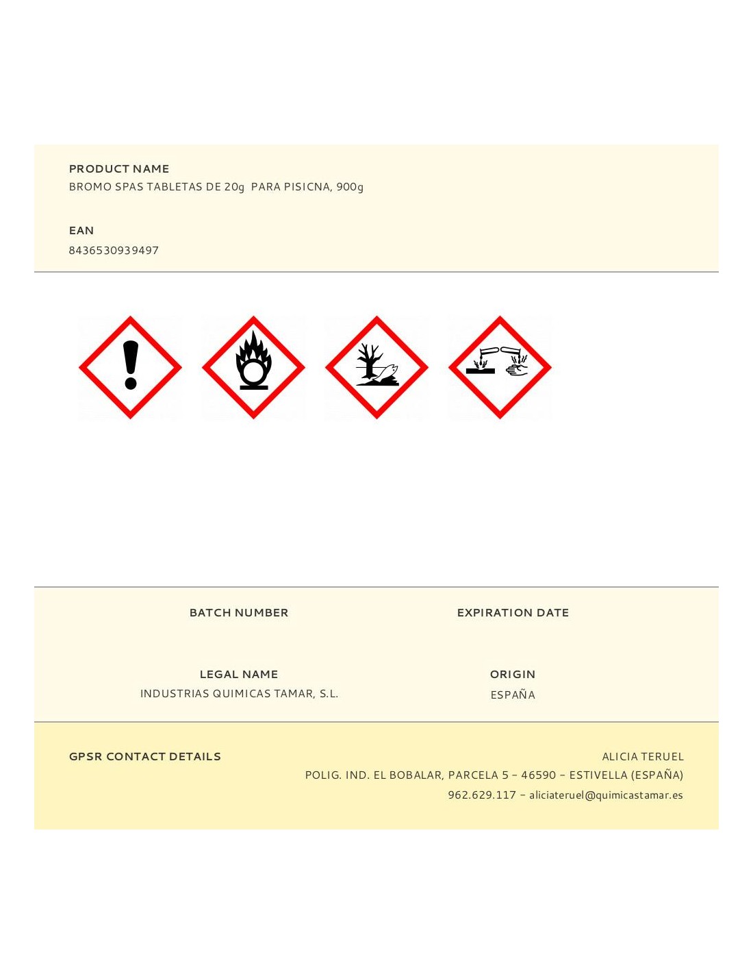 Bromo spas para piscina. desinfectante basado en bromo. tabletas de 20 g que contienen sustancia activa desinfectante, elimina bacterias, virus, hongos y las impurezas orgánicas del agua a través de la oxidación. recomendada para tratar el agua de piscinas cubiertas, spas, etc. ya que no genera gases de cloro. 900g