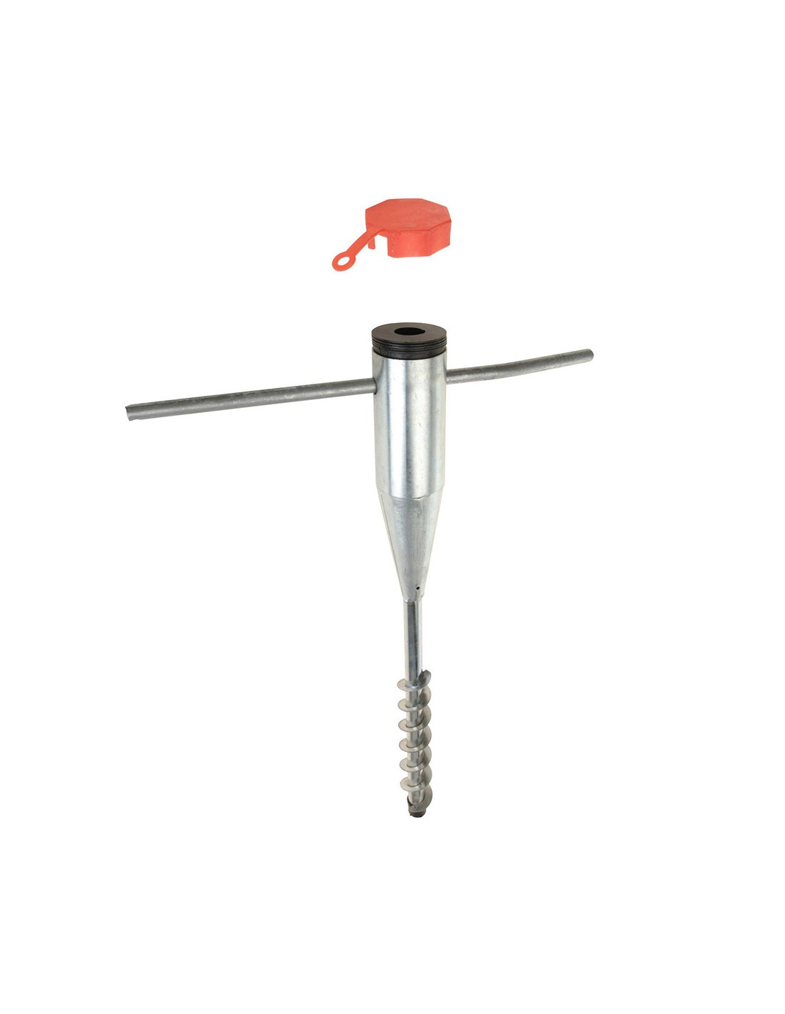Pie parasol espiral de metal, con la barra de hierro para hacer girar desmontable, 5 adaptadores: ø 25 mm, ø28 mm, ø42 mm, ø50 mm y ø55 mm medida enclavamieto 29 cm, con protector de pvc para la punta, lleva una tapa para poder guardar todos los accesorios en el interior medida total ø7 x 56 cm