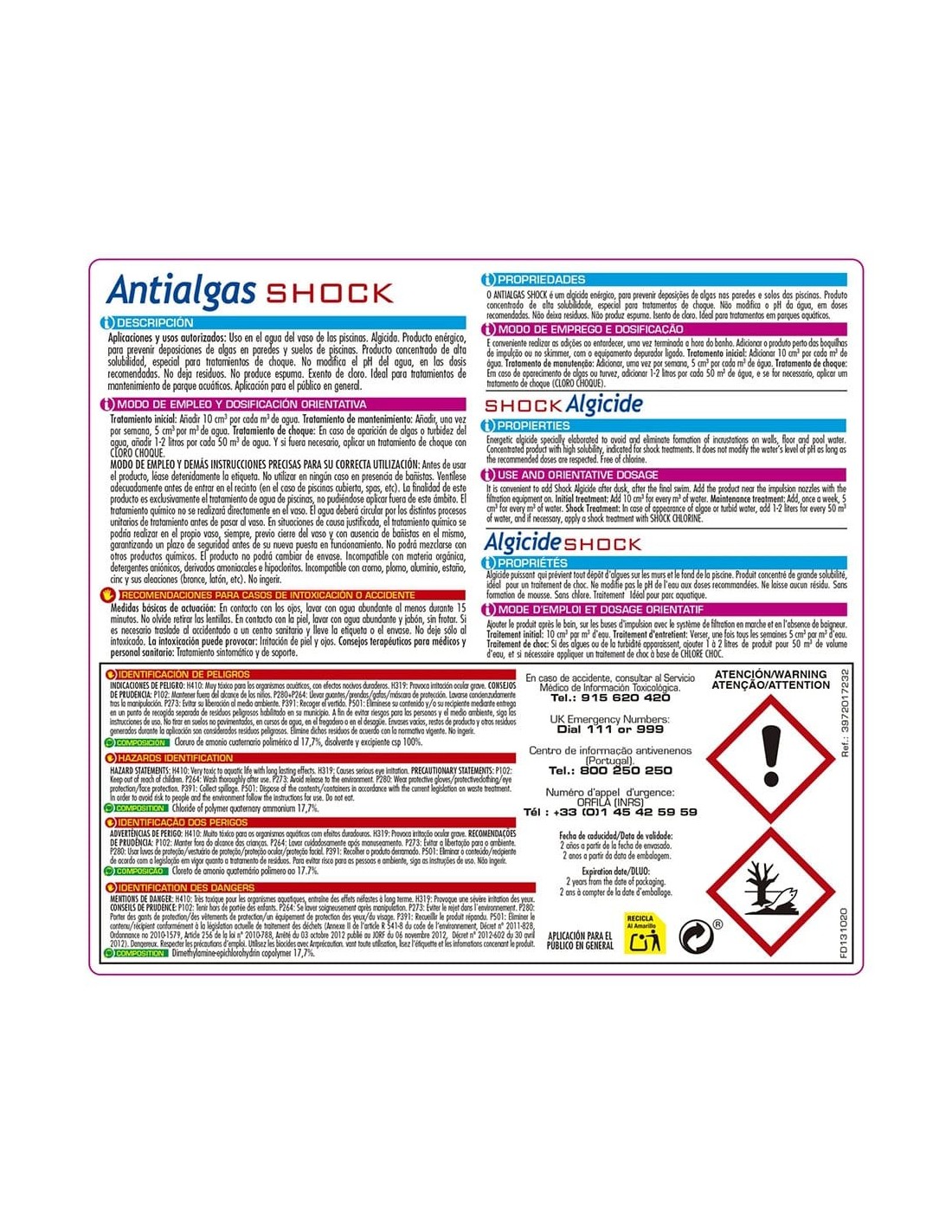 Antialgas enérgico, para prevenir y eliminar incrustaciones de algas en paredes y suelos de piscinas. producto concentrado de alta solubilidad, especial para tratamientos de choque. no modifica el ph del agua, en las dosis recomendadas. no deja residuos, no produce espuma, exento de cloro. ideal para el tratamiento de parques acuáticos