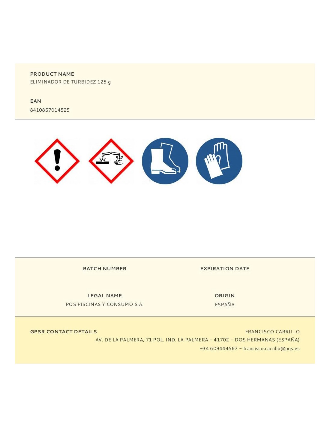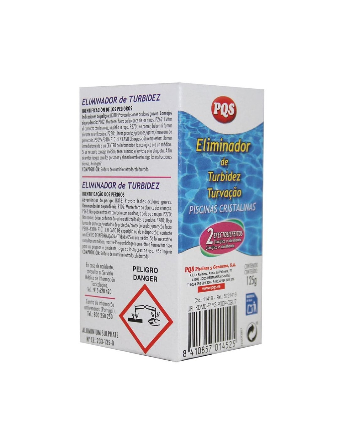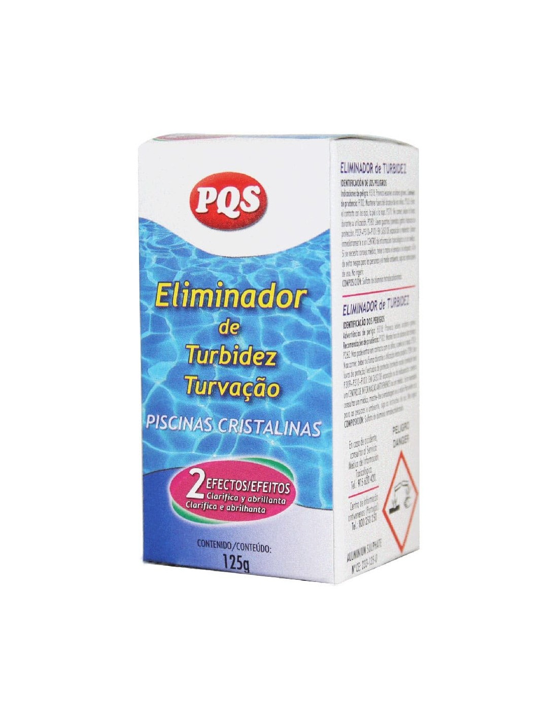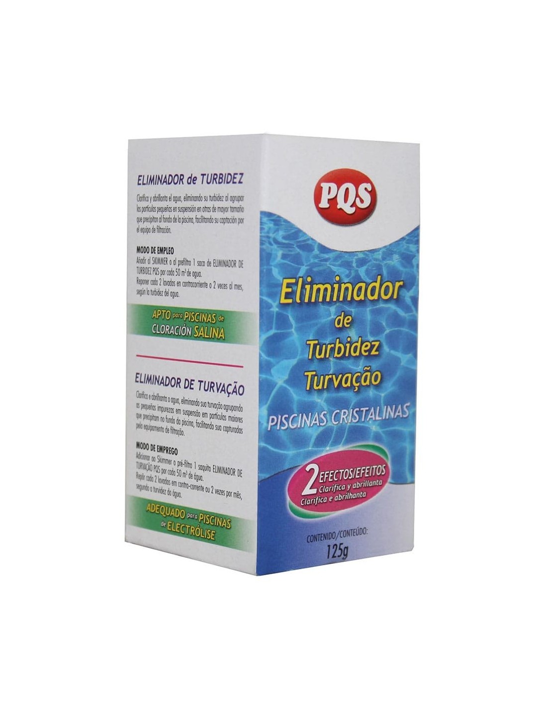 Eliminador de turbidez 125 g. apto para piscinas de electrólisis clarifica y abrillanta el agua eliminando su turbidez al agrupar las partículas pequeñas en suspensión en otras de mayor tamaño que precipitan al fondo de la piscina, facilitando su captación por el equipo de filtración