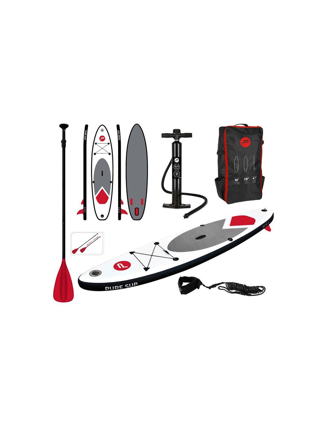 Tabla de paddle surf hinchable incluye remo telescópico de aluminio de 170-210 cm, aleta desmontable + 2 quillas de pp, bomba de hinchado de 1,0 bar / 15 psi, kit de reparación y mochila de transporte dispone de dos anillas en d para asiento, no incluido, correa en espiral y manual carga máxima 150 kg dimensiones 305 x 71 x 10 cm