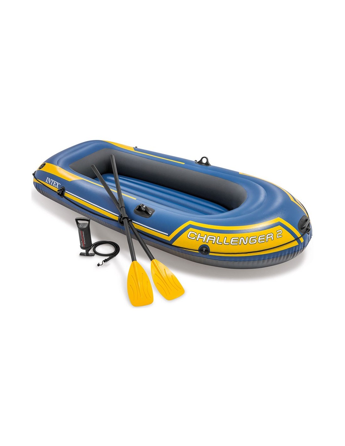Barca challenger para 2 personas con 2 remos, cuerda de agarre alrededor de la barca, asa en la proa, horquillas y fijación para los remos válvulas tipo boston para inflado y desinflado rápido, vinilo altamente resistente a los pinchazos. carga máxima: 200 kg. incluye: 1 bomba de hinchado, parche de reparación. dimensiones: 236 x 114 x 41 cm