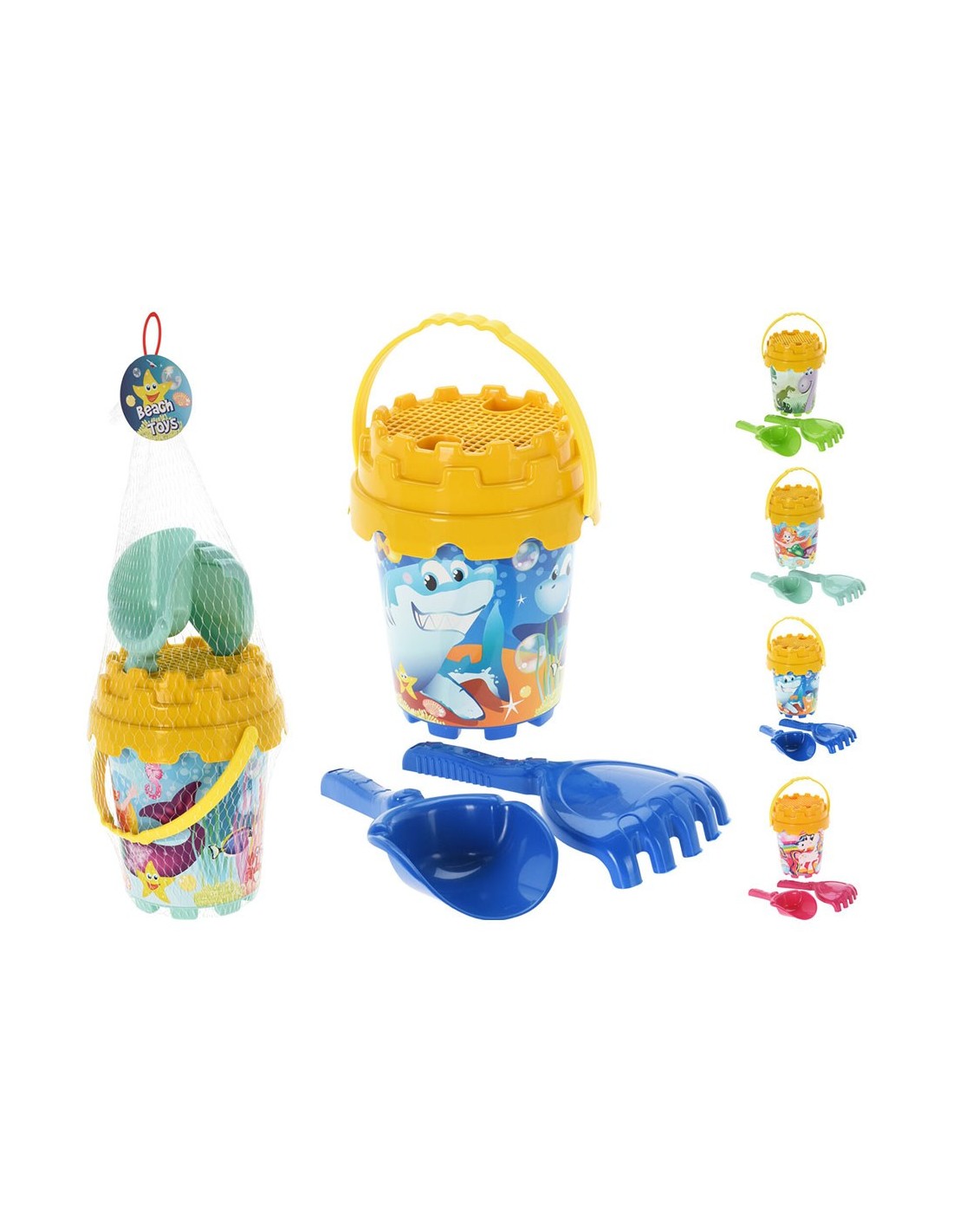 Cubo de playa infantil contiene cubo, criba, pala y rastrillo, modelos variados