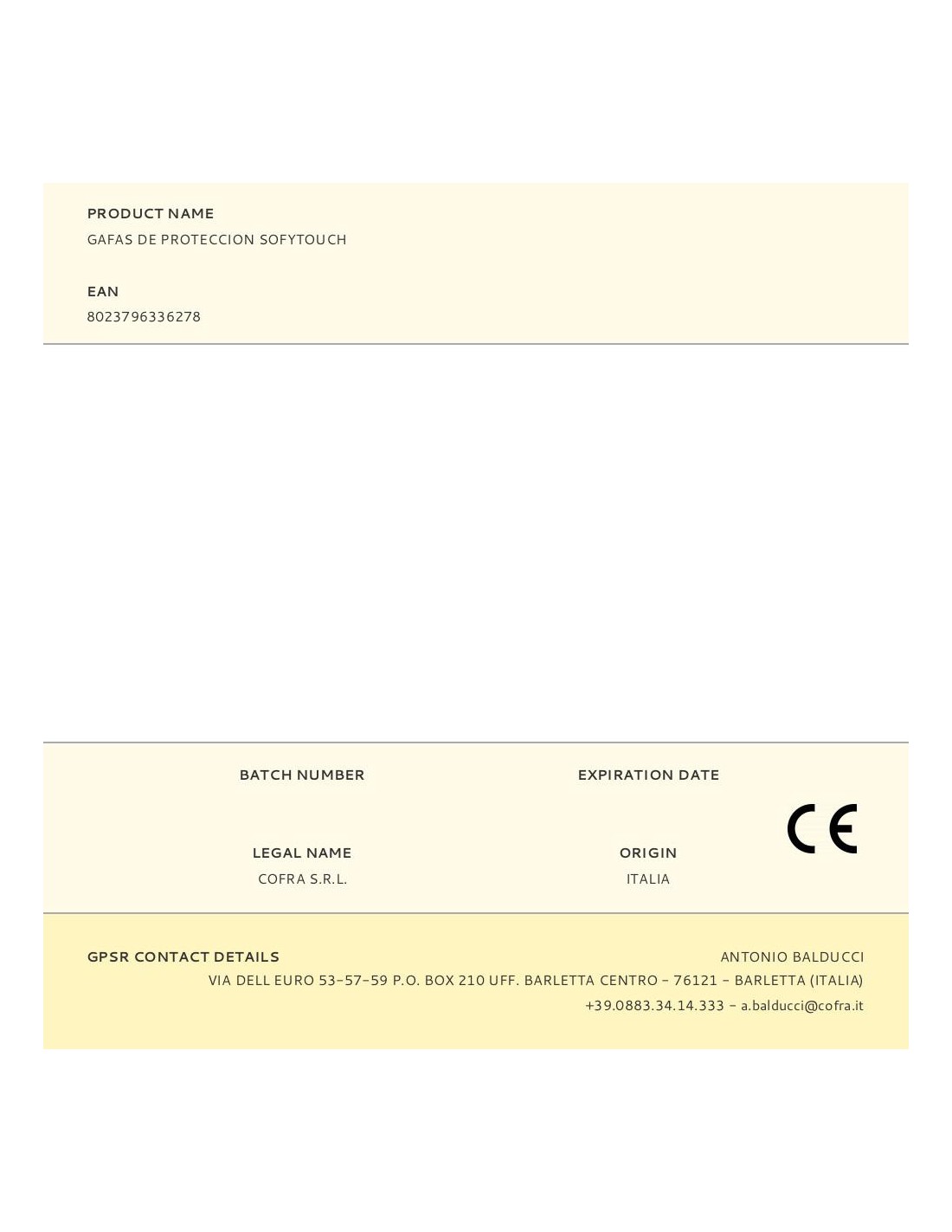 Gafas de proteccion sofytouch. lente: policarbonato, incoloro, curvatura 5, normas en 166 - en 170.do 1bt 9 ce. anti-rayado, anti-empañante. montura frontal pvc,do en 166 3 4 9 bt ce. peso 110g. para trabajos mecanicos en lugares cerrados con buenas condiciones de visibilidad. compatible con el uso de gafas graduadas y mascarillas antipolvo, confort excelente.