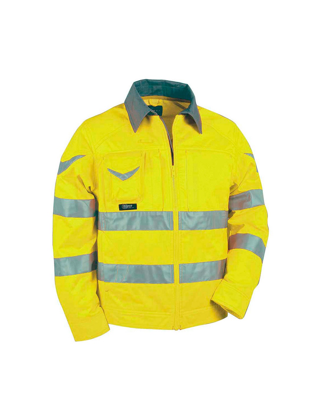 Cazadora warning talla 56 amplios bolsillos delanteros, bandas en insertos reflectantes 3m y scotchlite. incluye bolsillo para telefono movil con tejido aislante e-ward, bolsillos en el pecho, cintura y puños ajustables, corte ergonomico de las mangas, doble bolsillo interior, pasador auricular. composicion: 60% poliester 40% algodon. gramaje 290g/m color amarillo. ideal para agricultura, ferrocarril, industria logística, trabajos de carreteria....
