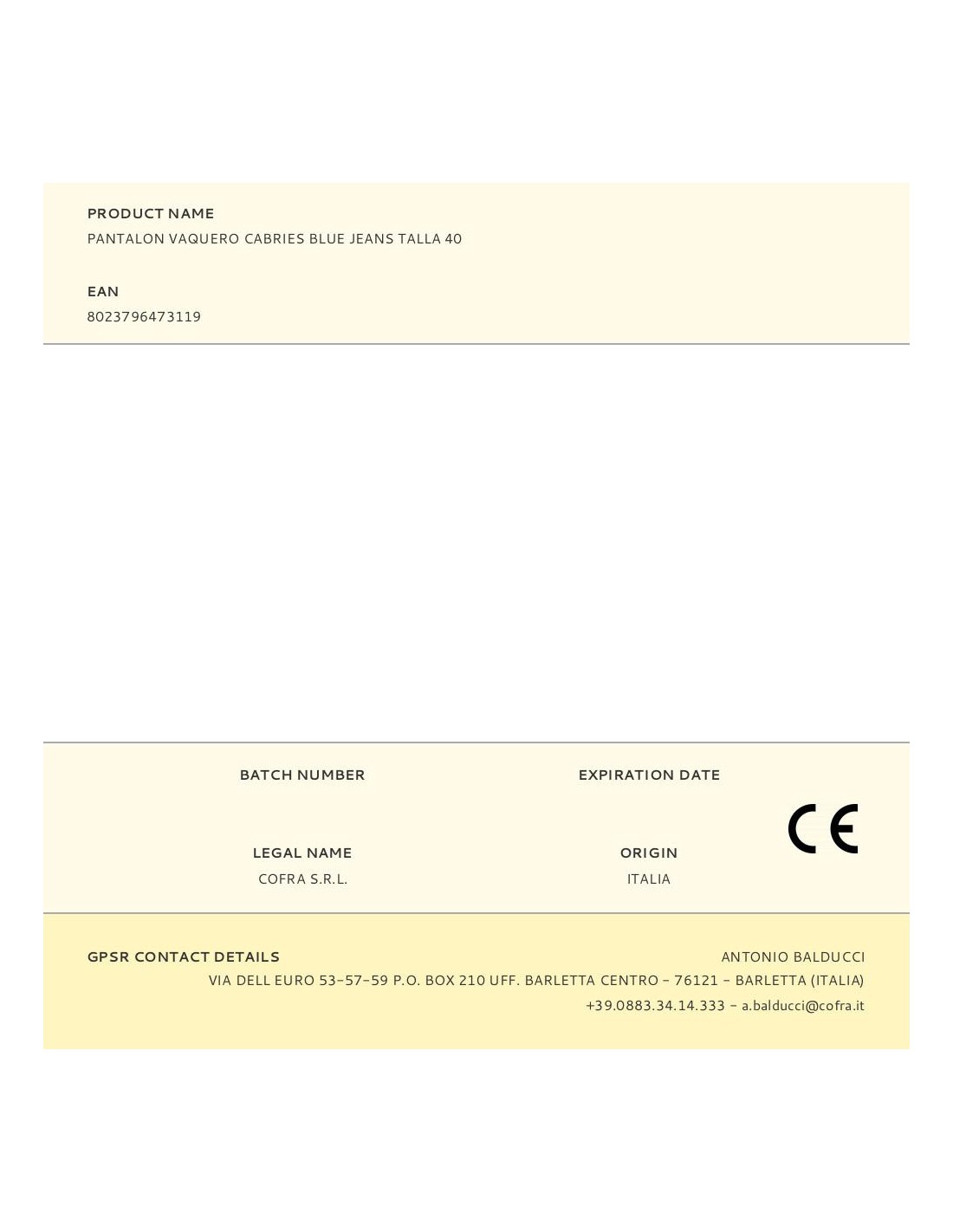 Pantalon vaquero cabries blue jeans talla 40. 2 bolsillos delanteros, 2 bolsillos traseros, bolsillo porta metro, triple costura en las partes que se desgastan más rápidamente, bajo de las piernas con solapa, bolsillo lateral izquierdo con tapeta, bolsillo porta monedas, buena resistencia a las abrasiones, buena resistencia a los lavados, corte ergonómico de las piernas y rodillas, cremallera ykk®, pasador portamartillo, remaches y costuras reforzadas en las zonas de mayor desgaste para una larga durabilidad en el tiempo, tejido elástico. composición: 70% algodón - 28% poliéster - 2% elastán. gramaje: 330g/m
