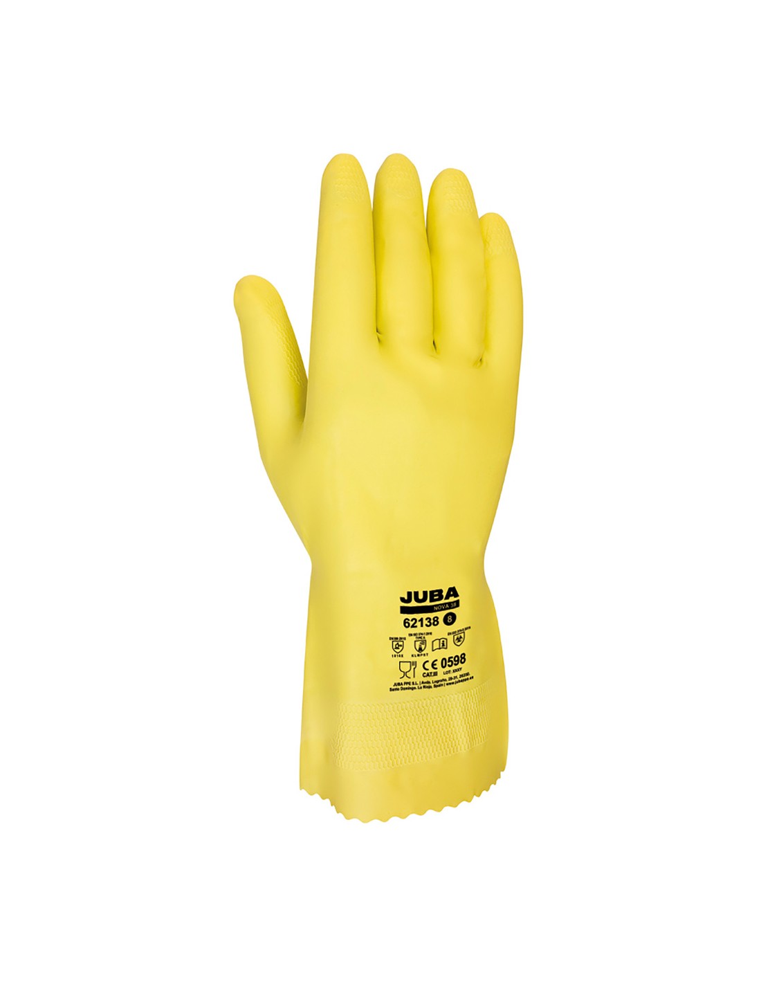 Guante de trabajo con químicos, nova 38, eco, t-08, de látex flocado ligero, amarillo agarre optimo protege contra las siguientes sustancias químicas: metanol nivel 1 (10min), hidróxido sódico 40% nivel 6 (480min), ácido sulfúrico 96% nivel 2 (30 min), ácido nítrico 65% nivel 4 (120min), ácido acético nivel 1 (10min), peróxido de hidrógeno 65% nivel 4 (120min), ácido fluorhídrico 40% nivel 5 (240min), formaldehído 37% nivel 6 (480min). para bacterias y hongos estanqueidad total según en 374-2:2014