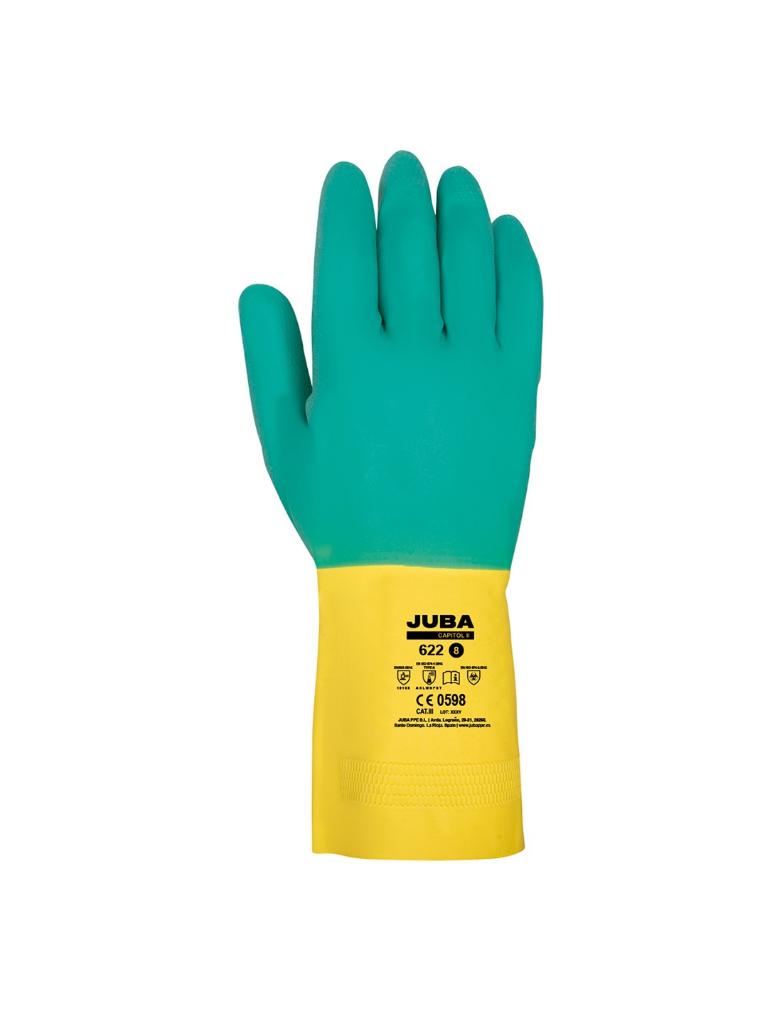 Guante de trabajo capitol ii, bicolor verde / amarillo, t-06, de latex flocado baño extra látex en palma aditivos vacteriostáticos y fungicidas patrón antidesclizante panel de abeja para óptimo agarre en ambientes húmedos y secos usos: industria química, laboratorios,industria pesqura y cárnica, mantenimiento y montajes ligeros, construcción, agricultura