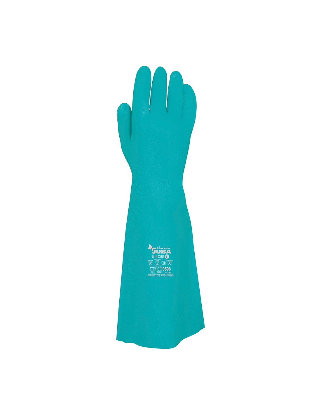 Guante trabajos piscina nitrilo satinado verde, garden, t-08 flocado sin soporte, extra largo 46 cm, extra grosor 0,55 mm manipulación de cajas, botes químicos para piscinas, análisis de agua, limpieza de piscinas. desatascos de arquetas y pozos. tratamiento fitosanitario