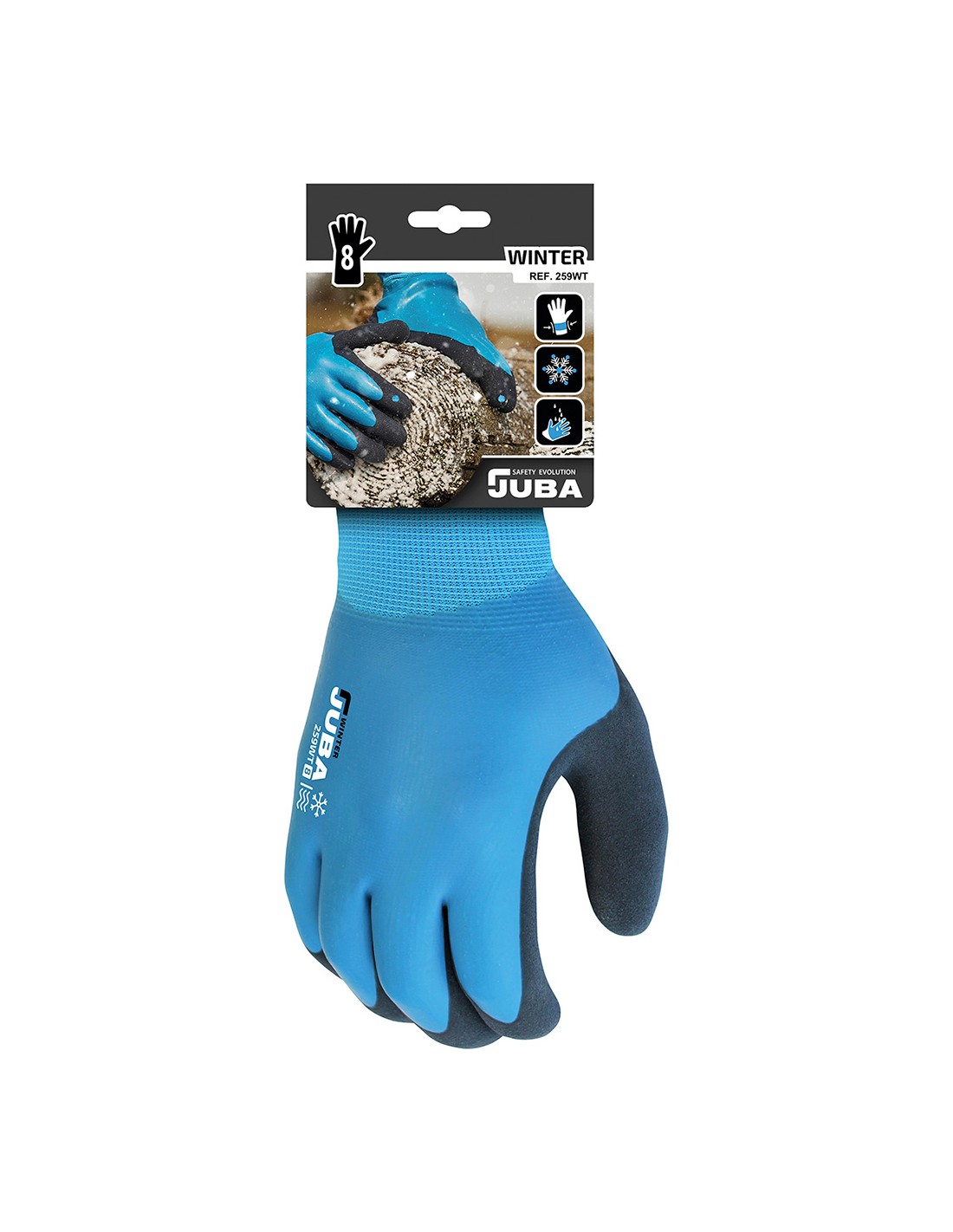 Guante trabajo poliéster doble recubrimiento látex, ice blue, t-08 para trabajos en frío, con forro interior vulrizo, ayuda a mantener la temperatura de las manos estable en ambientes fríos hasta 0c cierre en la muñeca con cinta elástica para cámaras frigoríficas, manipulación de alimentos congelados, transporte y reparto de productos congelados