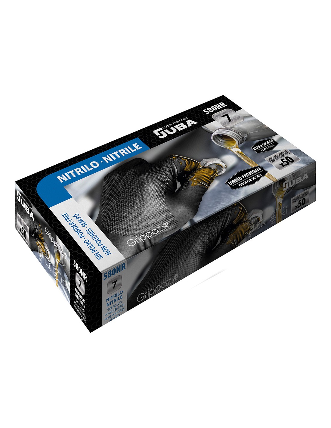 Caja 50 guante desechables de nitrilo, negro sin polvo t-08, ambidiextro. grosor 0,15 mm. usos: montajes, pintura en spray, industría química (riesgos mínimos), mantenimiento de vehículos, servicios de limpieza, agricultura, horticultura, talleres, uso general