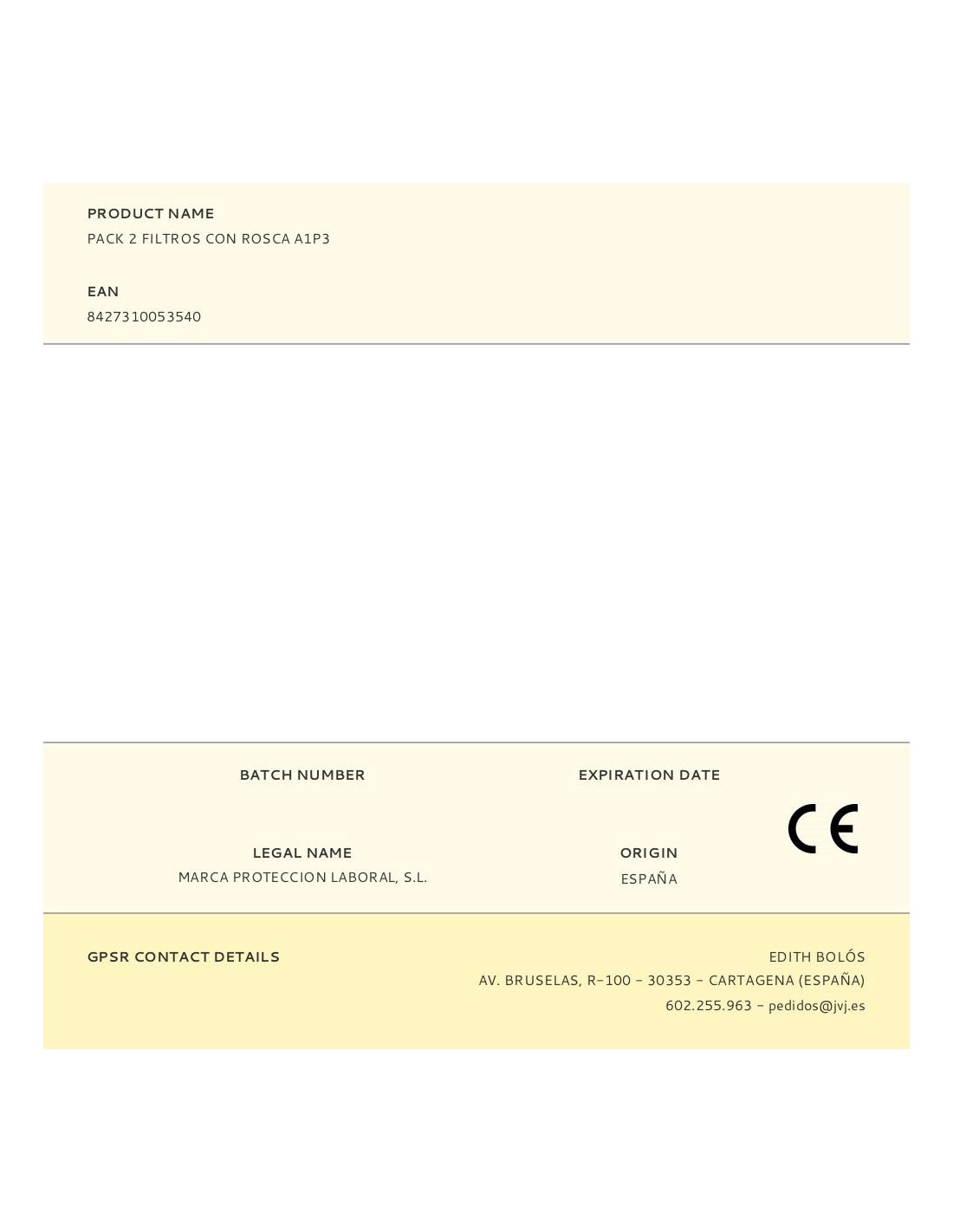 Pack 2 filtros con rosca a1p3. gases y vapores orgánicos clase 1 y partículas clase 3. usos y empleo: pintura y decoración (pintura en spray, disolventes, barnices, resinas), fabricación (vehículos, buques, electrodomésticos, tintes y pigmentos, adhesivos, alimentaria), mantenimientos con presencia de nieblas orgánicas y sustancias orgánicas, industria (humos y vapores orgánicos, procesos químicos orgánicos), agricultura y jardinería (estiércol, manipulación orgánica, pesticidas), ganadería, limpieza con disolventes.