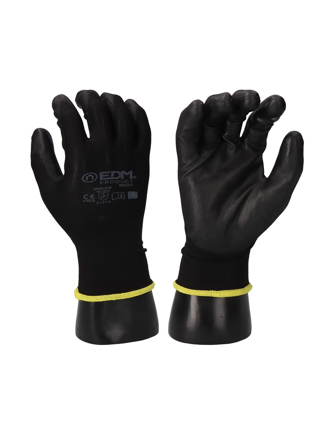Guante keep safe, poliéster t-09 con palma de poliuretano negro. usos: bricolaje, trabajos en el campo, almacenamiento y reposición, manipulación, montaje y ensamblaje de piezas en entornos secos, ligeramente húmedos o engrasados.